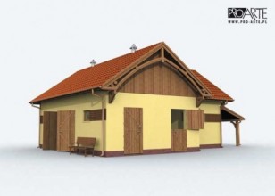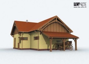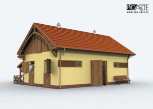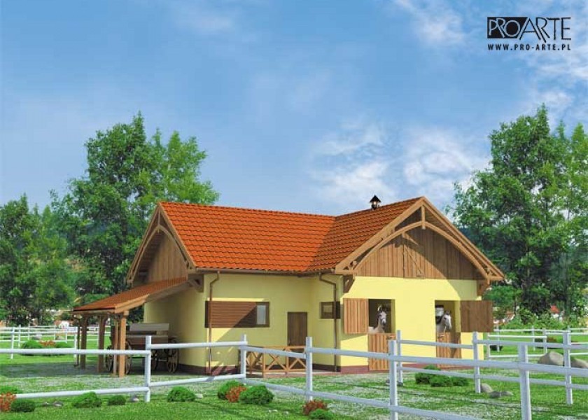 Stajnia S9 została zaprojektowana tak, by zaspokoić potrzeby bytowe czterech koni. Zaopatrzono ją w cztery wygodne boksy o powierzchni 10,5m2, z których każdy posiada dwa wyjścia – jedno bezpośrednio z boksu na zewnątrz, drugie, poprowadzonym przez środek budynku stajennego, przestronnym korytarzem. Są tutaj także pomieszczenia, dzięki którym zapewnimy koniom i jeźdźcom wspaniałe warunki – mamy bowiem obszerną paszalnię, do której wchodzi się z komunikacji wewnątrz budynku, siodlarnię, z której można przejść do komunikacji prowadzącej do boksów. Z siodlarni można także przejść do obszernej łazienki lub wyjść na zewnątrz budynku. Przy zachodniej ścianie zaprojektowano wiatę, pod którą można schronić np. różnego rodzaju powozy. Czy ten projekt zaspokoi Twoje potrzeby?Projekt stajni dla koni. Projekt stajni składa się z czterech egzemplarzy a w tym części architektonicznej, konstrukcyjnej, wewnętrznych instalacji wod.-kan i instalacji wewnętrznej elektrycznej. W projekcie załączone są podstawowe zestawienie stali, drewna i stolarki okienno-drzwiowej. Do projektu dołączamy bezpłatną zgodę na wprowadzenie zmian, oświadczenie projektantów o wykonaniu projektu zgodnie z obowiązującymi normami i przepisami oraz kserokopie uprawnień projektantów wraz z aktualnym wpisem do izby.Projekt posiada poddasze użytkowe 22.95m2Kochasz konie? Zapraszamy do serwisu ogłoszeniowego i forum http://allekonie.pl