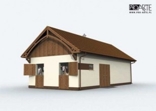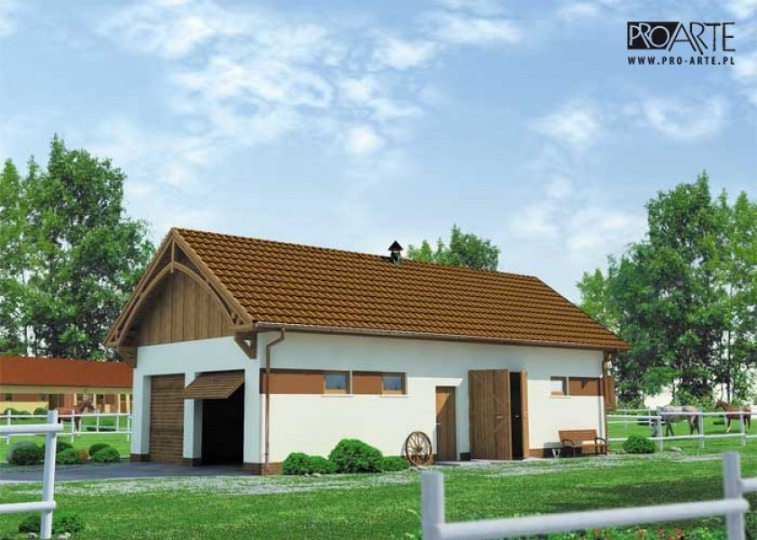 Prosta bryła budynku, a zarazem funkcjonalne wnętrze, to cechy charakterystyczne tego projektu. Stanowi on idealne połączenie stajni dla dwóch koni i dwustanowiskowego garażu. Nie ma tutaj jednak odrębnych pomieszczeń na paszę czy siodła, nie ma łazienki. Tego typu stajnia musiałaby zatem powstać w miejscu, gdzie będzie istniało odpowiednie zaplecze sanitarne. Boksy zostały usytuowane przy wschodniej ścianie budynku. Każdy z nich posiada dwa wyjścia – jedno bezpośrednio na zewnątrz, drugie – do komunikacji wychodzącej na północ i południe budynku. Przy zachodniej jego ścianie przewidziano dwa odrębne wjazdy dla samochodów. Mamy tu przestronny, dwustanowiskowy garaż z dodatkową przestrzenią na warsztat i z dodatkowym wejściem od południa. Czy ten projekt zaspokoi wszystkie Twoje potrzeby i oczekiwania?Projekt stajni dla koni. Projekt stajni składa się z czterech egzemplarzy a w tym części architektonicznej, konstrukcyjnej, wewnętrznych instalacji wod.-kan i instalacji wewnętrznej elektrycznej. W projekcie załączone są podstawowe zestawienie stali, drewna i stolarki okienno-drzwiowej. Do projektu dołączamy bezpłatną zgodę na wprowadzenie zmian, oświadczenie projektantów o wykonaniu projektu zgodnie z obowiązującymi normami i przepisami oraz kserokopie uprawnień projektantów wraz z aktualnym wpisem do izby.Projekt posiada poddasze użytkowe (skład na siano i słomę) 16.81m2.Kochasz konie? Zapraszamy do serwisu ogłoszeniowego i forum http://allekonie.pl