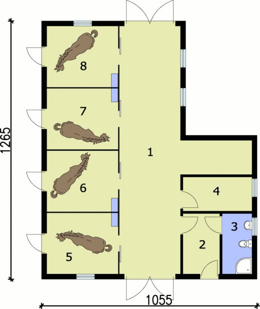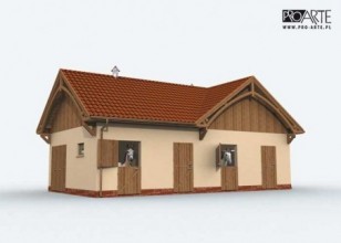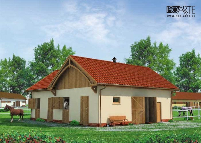 Ta stajnia jest zaprojektowana na planie litery „L”. Zostały tutaj przewidziane cztery równe boksy, z których każdy posiada dwa wyjścia – jedno do komunikacji, posiadającej wyjście na północy i południu budynku, oraz drugie – bezpośrednio z każdego boksu. Projekt ten został pomyślany tak, by mieszkające tutaj konie, mogły prosto z boksu wychodzić na wybieg, urządzony przy zachodniej ścianie budynku. Ponadto mamy przy wschodniej ścianie pomieszczenia pomocnicze, niezbędne przy hodowli koni, a więc jest część gospodarcza, paszalnia oraz siodlarnia z dostępem do łazienki i osobnym wejściem z zewnątrz. Ta stajnia jest bardzo przestrzenna. Wszystkie pomieszczenia mają optymalne gabaryty. Już na pierwszy rzut oka widać, że jest projektem przeznaczonym dla osób, które cenią komfort hodowanych koni, ale nie myślą o rozwijaniu hodowli. Co sądzisz o takim rozwiązaniu?Projekt stajni dla koni. Projekt stajni składa się z czterech egzemplarzy a w tym części architektonicznej, konstrukcyjnej i instalacji wewnętrznej elektrycznej. W projekcie załączone są podstawowe zestawienie stali, drewna i stolarki okienno-drzwiowej. Do projektu dołączamy bezpłatną zgodę na wprowadzenie zmian, oświadczenie projektantów o wykonaniu projektu zgodnie z obowiązującymi normami i przepisami oraz kserokopie uprawnień projektantów wraz z aktualnym wpisem do izby.Kochasz konie? Zapraszamy do serwisu ogłoszeniowego i forum najnowszych. Zobacz najnowsze ogłoszenia.