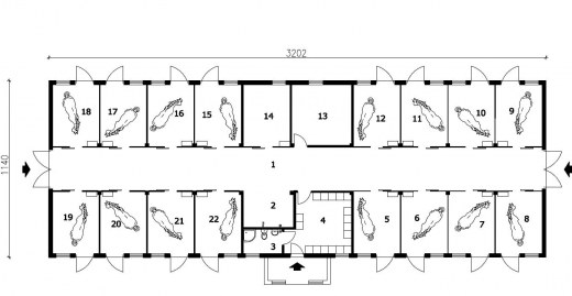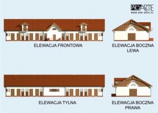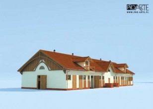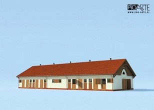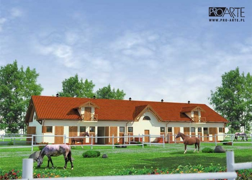 Stajnia dla koni - S22- 16 boksów Niezwykły, odwołujący się swą architekturą do tradycji staropolskich, projekt obszernej stajni. Został stworzony dla szesnastu koni, dodatkowy, siedemnasty boks, stanowi izolatkę. Do środka prowadzą trzy wejścia, dwa wieńczące komunikację od wschodu i zachodu, trzecie w centralnej części budynku prowadzi przez siodlarnię do łazienki lub obszernej komunikacji. Same boksy rozmieszczono przy północnej i południowej ścianie budynku. Przy siodlarni urządzono myjnię dla koni. Naprzeciwko niej znajduje się obszerna paszalnia oraz wspomniana izolatka dla koni, która jako jedyny boks posiada wejście tylko przez komunikację wewnątrz budynku. Pozostałe boksy mają dwa wejścia, jedno właśnie z komunikacji, drugie bezpośrednio z boksu. Same pomieszczenia dla koni są obszerne, każdy ma powierzchnię 12m2. Teraz już wiesz, że chcesz zbudować stajnię według tego projektu. Spełnia ona wszystkie kryteria, które powinna spełniać stajnia dla Twoich koni. Projekt stajni dla koni. Projekt stajni składa się z czterech egzemplarzy a w tym części architektonicznej, konstrukcyjnej i instalacji wewnętrznej elektrycznej. W projekcie załączone są podstawowe zestawienie stali, drewna i stolarki okienno-drzwiowej. Do projektu dołączamy bezpłatną zgodę na wprowadzenie zmian, oświadczenie projektantów o wykonaniu projektu zgodnie z obowiązującymi normami i przepisami oraz kserokopie uprawnień projektantów wraz z aktualnym wpisem do izby. Szerokość komunikacji : 2,8m Wymiary boksów: 3m x 3,5m W łazience zastosowano przepływowy podgrzewacz wody umywalkowo-natryskowy.Możliwość zakupu alternatywnej konstrukcji dachu w postaci wiązarów (projekt i wykonawstwo z montażem). Zapraszamy do kontaktu +48 33 811 89 57 ; mobil : +48 512 119 101, dachy@agrobud.ig.agrobud.pl, konstruktor@agrobud.ig.pl ; www.agrobud.eu Kochasz konie? Zapraszamy do serwisu ogłoszeniowego i forum http://allekonie.pl
