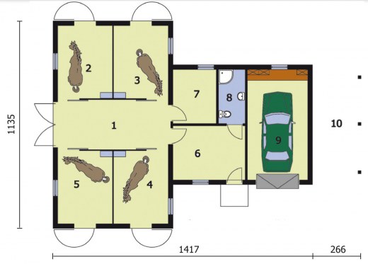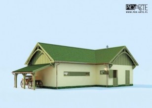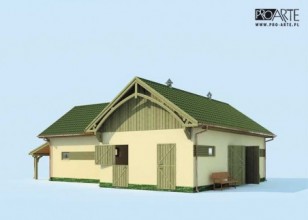 Projekt klasycznej stajni zbudowanej na planie odwróconej litery T. Główne wejście do stajni znajduje się przy zachodniej ścianie budynku i daje początek równie szerokiej komunikacji, wzdłuż której zostały ustawione naprzeciwko siebie wygodne boksy. Każdy z boksów został zaopatrzony w dodatkowe, bezpośrednie wyjście na zewnątrz. Warto zauważyć również, że w pobliżu boksów została przewidziana paszalnia. Do budynku można także wejść używając drzwi przewidzianych na południu. Prowadzą one do siodlarni, z której przechodzi się do łazienki lub do komunikacji. Ostatnim z pomieszczeń w tym budynku jest garaż z wjazdem od południa, usytuowany po wschodniej stronie budynku. Z tej strony przewidziano również niewielką wiatę. Nie jest to projekt pozwalający na rozwijanie hodowli, ale z pewnością zadowoli te osoby, które czują potrzebę posiadania własnych koni.Projekt stajni dla koni. Projekt stajni składa się z czterech egzemplarzy a w tym części architektonicznej, konstrukcyjnej, wewnętrznych instalacji wod.-kan i instalacji wewnętrznej elektrycznej. W projekcie załączone są podstawowe zestawienie stali, drewna i stolarki okienno-drzwiowej. Do projektu dołączamy bezpłatną zgodę na wprowadzenie zmian, oświadczenie projektantów o wykonaniu projektu zgodnie z obowiązującymi normami i przepisami oraz kserokopie uprawnień projektantów wraz z aktualnym wpisem do izby.Kochasz konie? Zapraszamy do serwisu ogłoszeniowego i forum http://allekonie.pl