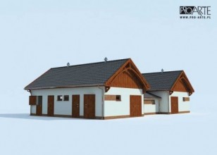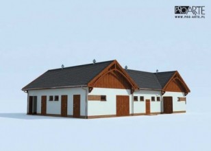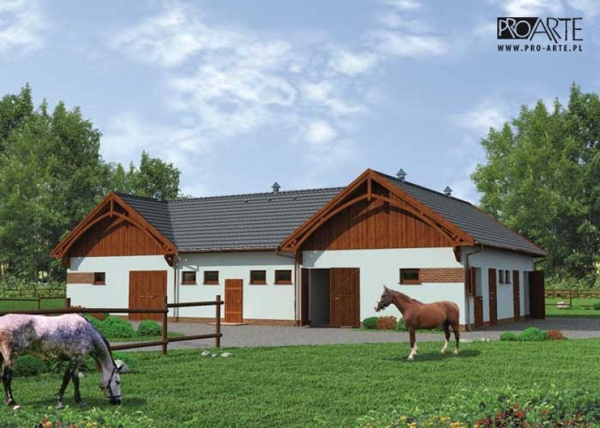 Oryginalny projekt stajni przeznaczonej dla ośmiu koni. Na uwagę w tym wypadku zasługują dwie obszerne, poprowadzone równolegle do siebie, komunikacje łączące po cztery boksy usytuowane przy wschodnim i zachodnim krańcu budynku. Dodatkowo, każdy boks, posiada osobne wyjście, bezpośrednio na zewnątrz. Warto jednak zauważyć, że w tej stajni nie ma dużego boksu, przewidzianego dla oźrebionej klaczy. Część centralna została przeznaczona na pomieszczenie gospodarcze, paszalnię, myjnię i siodlarnię z przejściem do łazienki. Osiem boksów w ciekawym układzie i dobre rozmieszczenie innych elementów niezbędnych przy hodowli koni, to niewątpliwe zalety tego projektu. Został on stworzony z myślą o osobach, które nie chcą rozwijać swojej stajni. Czy będzie to projekt odpowiadający Twoim oczekiwaniom?Projekt stajni dla koni. Projekt stajni składa się z czterech egzemplarzy a w tym części architektonicznej, konstrukcyjnej, wewnętrznych instalacji wod.-kan i instalacji wewnętrznej elektrycznej. W projekcie załączone są podstawowe zestawienie stali, drewna i stolarki okienno-drzwiowej. Do projektu dołączamy bezpłatną zgodę na wprowadzenie zmian, oświadczenie projektantów o wykonaniu projektu zgodnie z obowiązującymi normami i przepisami oraz kserokopie uprawnień projektantów wraz z aktualnym wpisem do izby.Kochasz konie? Zapraszamy do serwisu ogłoszeniowego i forum http://allekonie.pl