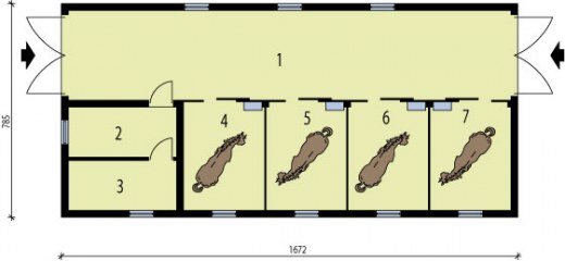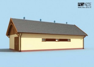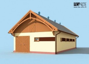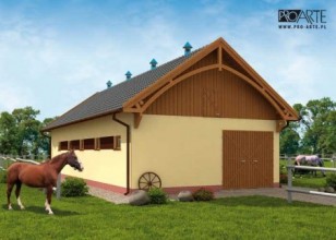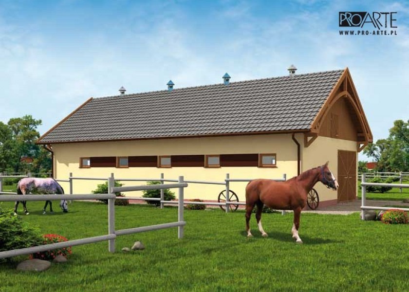 Projekt stajni dla koni S34. Długa komunikacja wewnętrzna biegnąca wzdłuż budynku, prowadzi do czterech przestronnych boksów przeznaczonych dla koni. W tym gustownym i praktycznym budynku znajdziemy również paszalnię i siodlarnię. Stajnia z pewnością sprawdzi się w przydomowej hodowli koni.Projekt stajni dla koni. Projekt stajni składa się z czterech egzemplarzy a w tym części architektonicznej, konstrukcyjnej, wewnętrznych instalacji wod.-kan i instalacji wewnętrznej elektrycznej. W projekcie załączone są podstawowe zestawienie stali, drewna i stolarki okienno-drzwiowej. Do projektu dołączamy bezpłatną zgodę na wprowadzenie zmian, oświadczenie projektantów o wykonaniu projektu zgodnie z obowiązującymi normami i przepisami oraz kserokopie uprawnień projektantów wraz z aktualnym wpisem do izby.Budynek parterowy ze strychem (121.40m2)Kochasz konie? Zapraszamy do serwisu ogłoszeniowego i forum http://allekonie.pl