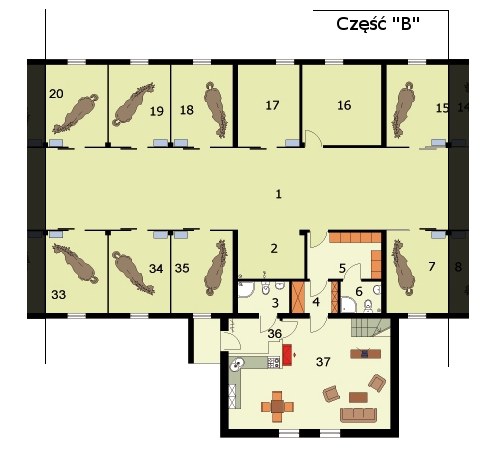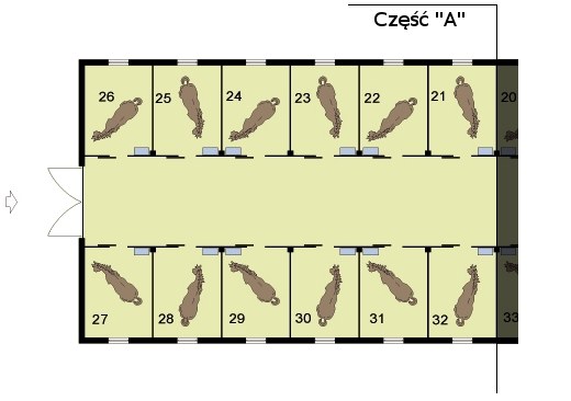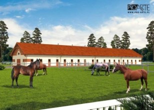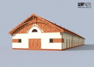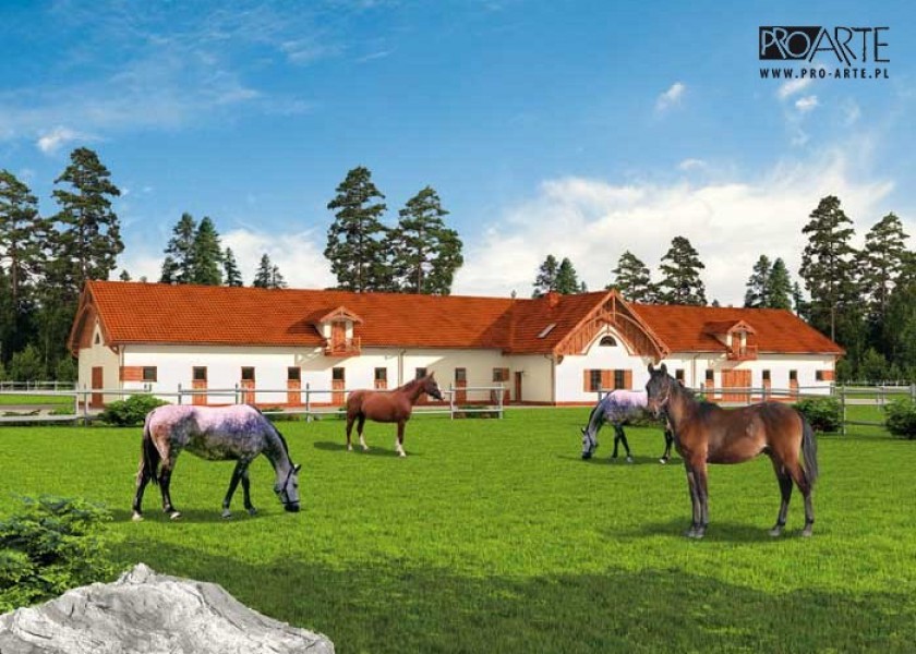 Stajnia na 26 koni z pomieszczeniem mieszkalnym i lążownikiemWymiary boksów: 3m x 4m Wymiary bram wejściowych 3,20m x 2,60m.Wyjątkowy projekt stajni, dla tych z Państwa, którzy chcą za jednym zamachem wejść w posiadanie stajni i domu. Ten projekt to wymarzony wybór dla miłośników koni. 26 boksów dla koni oraz część mieszkalna, na którą składa się m.in. pokój dzienny z łóżkami i aneksem kuchennym, łazienka, słowem wszystko, czego do życia potrzeba. Dzięki tej stajni Twoje marzenia są bliskie spełnienia. 26 boksów, izolatki dla konia, paszarnia, siodlarnia, myjnia, składy gospodarcze, pomieszczenie pomocnicze, lążownik oraz część mieszkalna dla ludzi to elementy stajni S40. We wschodniej części przeznaczonej dla koni znajduje się boks powiększony, będący dogodnym pomieszczeniem dla oźrebionej klaczy. Natomiast w części przeznaczonej dla pracowników obsługi lub właścicieli znajdziemy 2 niezależne łazienki, jedną na parterze jedną na poddaszu, pokój dzienny z aneksem kuchennym oraz pokój z możliwością dowolnej adaptacji na piętrze.Projekt stajni dla koni. Projekt stajni składa się z czterech egzemplarzy a w tym części architektonicznej, konstrukcyjnej, wewnętrznych instalacji wod.-kan i instalacji wewnętrznej elektrycznej. W projekcie załączone są podstawowe zestawienie stali, drewna i stolarki okienno-drzwiowej. Do projektu dołączamy bezpłatną zgodę na wprowadzenie zmian, oświadczenie projektantów o wykonaniu projektu zgodnie z obowiązującymi normami i przepisami oraz kserokopie uprawnień projektantów wraz z aktualnym wpisem do izby.Możliwość zakupu alternatywnej konstrukcji dachu w postaci wiązarów (projekt, wykonawstwo i montaż). Zapraszamy do kontaktu +48 33 811 89 57 ; mobil : +48 512 119 101, dachy@agrobud.ig.agrobud.pl, konstruktor@agrobud.ig.pl ; www.agrobud.eu Kochasz konie? Zapraszamy do serwisu ogłoszeniowego i forum http://allekonie.pl