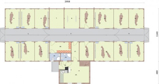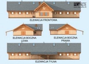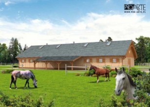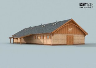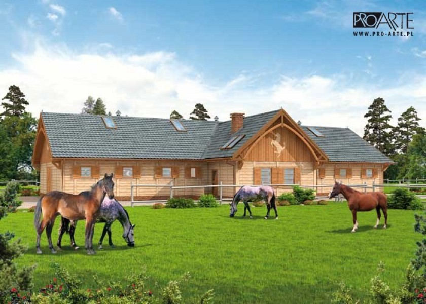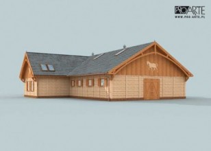 Projekt stajni S23 z bali drewnianych na 9 koni z częścią mieszkalnąOgromna stajnia dla osób pragnących zająć się profesjonalna hodowlą koni, którą będzie się rozwijać. W tym niesamowitym projekcie przewidziano także część mieszkalną. Sama stajnia została podzielona na cztery części. Idąc szeroką komunikacją od lewej strony, miniemy sześć obszernych boksów (każdy o powierzchni 12m2), rozmieszonych przy północnej i południowej ścianie budynku. W środkowej części projektu przewidziano najwięcej różnorodnych pomieszczeń pomocniczych. Przy północnej ścianie budynku mamy myjnię dla koni, solarium oraz paszalnię. Po przeciwnej stronie natomiast, w części należącej do stajni, mamy przebieralnię z łazienką, siodlarnię oraz komunikację, prowadzącą do umieszczonej w uroczym wykuszu, części mieszkalnej, gdzie jest obszerna łazienka i pokój z aneksem kuchennym. Istnieje dodatkowe wejście przewidziane tylko i wyłącznie dla tej części budynku. Trzecia część stajni będzie służyła przede wszystkim rozwijaniu hodowli. Ustawiono tutaj naprzeciwko siebie dwa odrębne boksy dla klaczy, spełniające wszelkie wymogi przestrzenne potrzebne w takim wypadku, boks dla ogiera i wydzielono izolatkę. Oprócz tych pomieszczeń są jeszcze miejsca wyznaczone do składowania. W łazienkach zastosowano przepływowy podgrzewacz wody umywalkowo natryskowy. Część mieszkalna, przebieralnia oraz siodlarnia ogrzewana. Czynnik grzewczy z wkładu kominkowego rozprowadzony jest do rozdzielacza i dalej do grzejników. Wszystkie pomieszczenia w budynku są połączone szeroką komunikacją poprowadzoną od wschodu ku zachodowi budynku. Jest to niezwykły projekt, wymagający sporych nakładów finansowych przeznaczony dla osób, które są zdecydowane zająć się profesjonalnie hodowlą koni i są gotowe zainwestować w to przedsięwzięcie duże nakłady finansowe. Z pewnością przy dobrym zarządzaniu, będzie to spłacona inwestycja.Projekt stajni dla koni. Projekt stajni składa się z czterech egzemplarzy a w tym części architektonicznej, konstrukcyjnej, wewnętrznych instalacji wod.-kan i instalacji wewnętrznej elektrycznej. W projekcie załączone są podstawowe zestawienie stali, drewna i stolarki okienno-drzwiowej. Do projektu dołączamy bezpłatną zgodę na wprowadzenie zmian, oświadczenie projektantów o wykonaniu projektu zgodnie z obowiązującymi normami i przepisami oraz kserokopie uprawnień projektantów wraz z aktualnym wpisem do izby.Kochasz konie? Zapraszamy do serwisu ogłoszeniowego i forum http://allekonie.pl