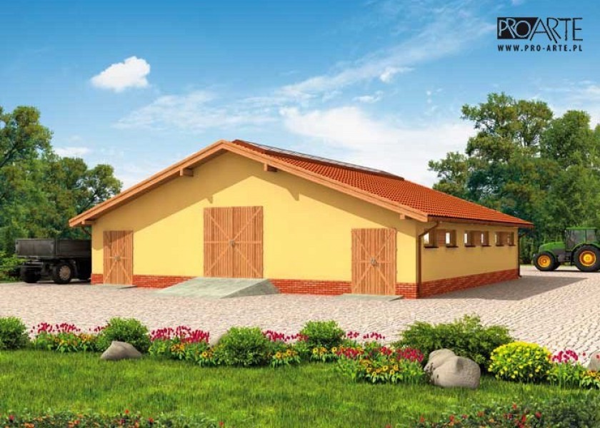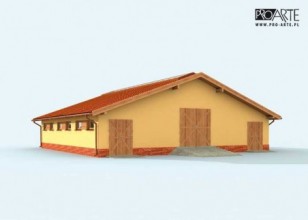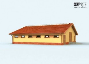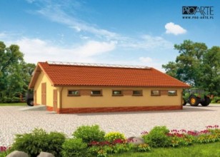 Budynek inwentarski - obora dla 22 krów mlecznych, uwięziowa (stanowiskowa, na płytkiej ściółce, wolnostojąca, parterowa, niepodpiwniczona). Wieloletnie przygotowania dały efekt finalny w postaci projektu budynku inwentarskiego. Wbrew pozorom obora, podobnie jak projekt domu mieszkalnego, wymaga wielu przygotowań oraz wiedzy na temat projektów tego typu. Do obory głównym wejściem można swobodnie wjechać ciągnikiem w celu podania paszy. Żadnych problemów nie sprawia też wywóz gnojownika. Można go zbierać mechanicznie lub ręcznie. Specjalnie do tego celu wyposażono oborę w osobne wejścia umożliwiające usunięcie nieczystości. Racjonalna gospodarka przestrzenią, ułatwienia pozwalające komfortowo oporządzać zwierzęta - to cechy tego projektu. Projekt składa się z części architektonicznej, konstrukcyjnej i wewnętrznej instalacji elektrycznej. W projekcie załączone są podstawowe zestawienie stali, drewna i stolarki okienno-drzwiowej. Do projektu dołączamy bezpłatną zgodę na wprowadzenie zmian, oświadczenie projektantów o wykonaniu projektu zgodnie z obowiązującymi normami i przepisami oraz kserokopie uprawnień projektantów wraz z aktualnym wpisem do izby. W przypadku zamówienia projektu w technologii lekkiej, drewnianej konstrukcji szkieletowej, powierzchnia użytkowa budynku jest o około 7% większa.