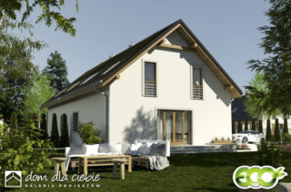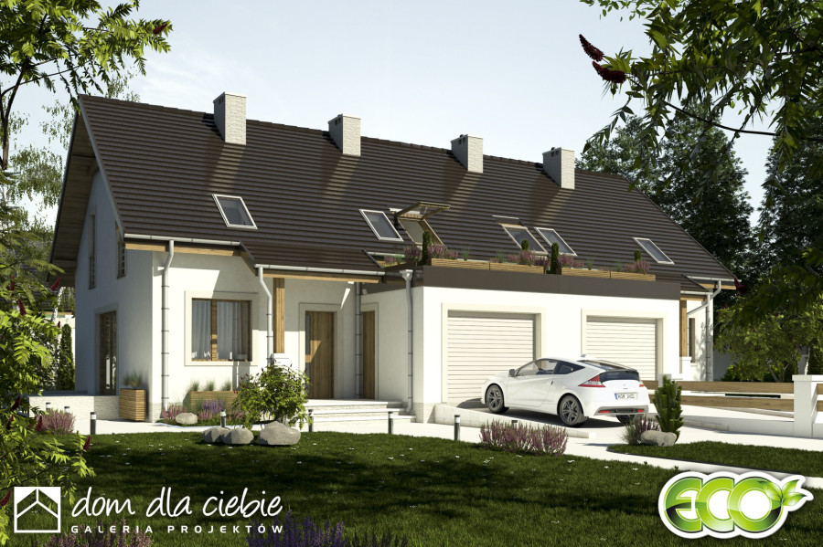 (Uwaga: projekty typu bliźniak oferujemy jako domy dwulokalowe, projekt można zamówić również w zabudowie bliźniaczej) Dom jednorodzinny dla 4 osobowej rodziny, Funkcja parteru zawiera salon, jadalnię z kuchnia dodatkowy pokój, hol. łazienkę, wiatrołap, Garaż i kotłownię na paliwo stałe. Na poddaszu zaprojektowano trzy sypialnie, garderobę i łazienkę. Dodatkowym atutem jest zielony taras nad garażem. Dom na prostą konstrukcję, dobre proporcje i przyjazny wygląd.