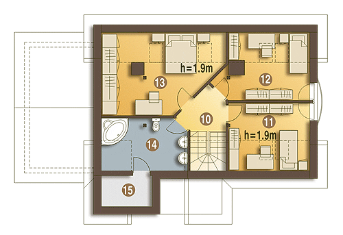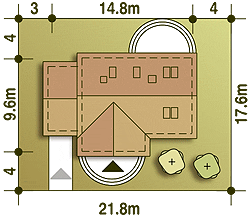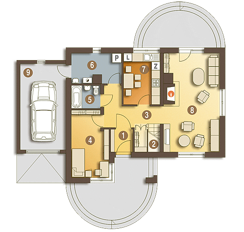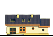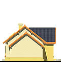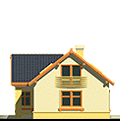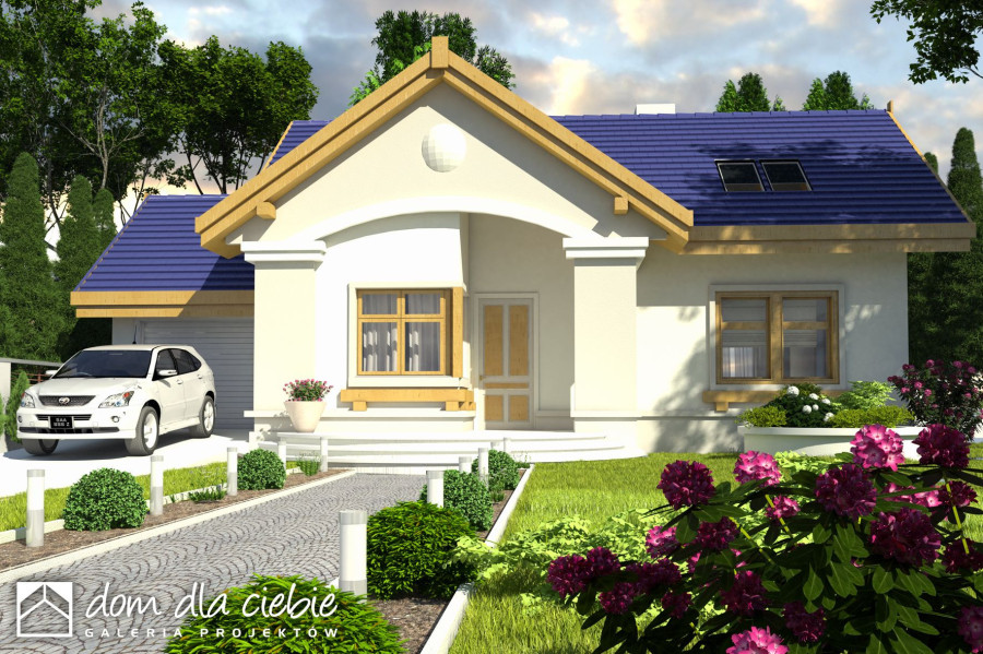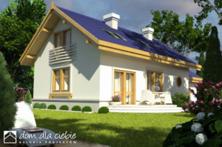 Nieduży i bardzo wygodny dom parterowy z poddaszem użytkowym przeznaczony dla 4-5 osobowej rodziny. Na parterze zaprojektowano wiatrołap, hol, pokój gościnny, salon, oddzielną kuchnię oraz łazienkę. Garaż połączony jest z częścią mieszkalną poprzez pomieszczenie gospodarczo-techniczne, w którym znajduje się piec CO. Na przeciwko wejścia do kuchni zaprojektowano klatkę schodową prowadzącą na poddasze, gdzie znajdują się trzy wygodne sypialnie oraz duża łazienka. Dzięki prostej konstrukcji dom będzie tani w realizacji oraz w eksploatacji.fundamenty: BETONOWE ściany zewnętrzne: POROTHERM+STYROPIAN TERMO ORGANIKA ściany wewnętrzne: POROTHERM rodzaj stropu: TERIVA elewacje: TYNK AKRYLOWY pokrycie dachu: DACHÓWKA CEM. lub CER