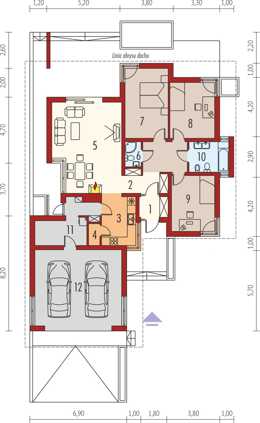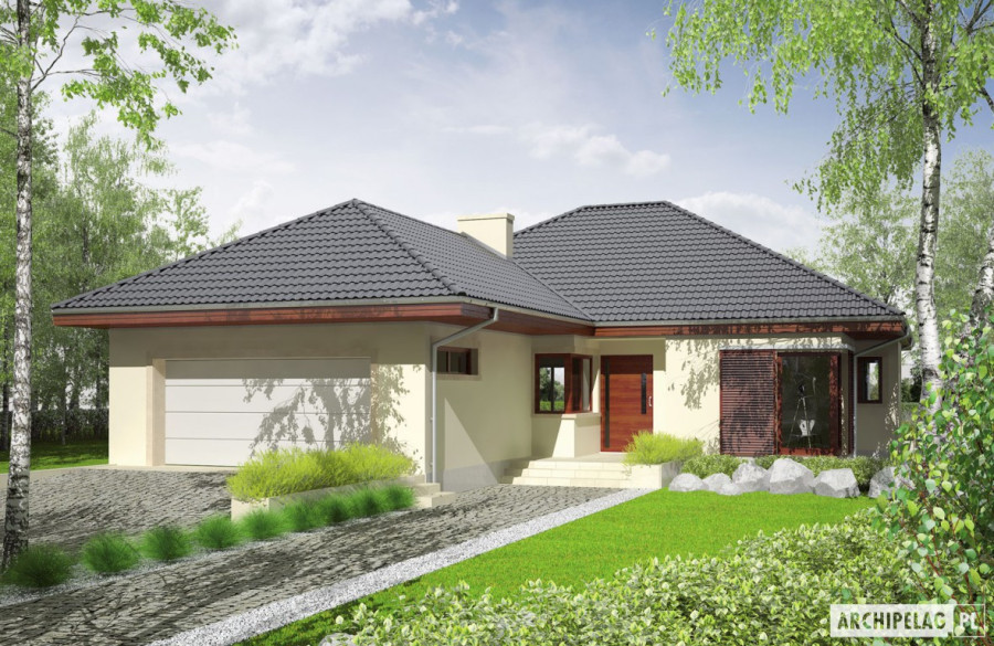 Charakterystyka: Dom parterowy, niepodpiwniczony, z garażem dwustanowiskowym Przeznaczenie: Dom dla 3-4 osobowej rodzinyTechnologia i konstrukcja: Ściany zewnętrzne: murowane, Strop: gęstożebrowy Dach: konstrukcja drewniana, dachówka cementowa lub ceramiczna Więźba dachowa dostępna również w systemie prefabrykacji drewnianej.Rozwiązania instalacyjne: Ogrzewanie: kocioł gazowy, rozprowadzenie ciepła: grzejniki Wentylacja: grawitacyjna Wykończenie: Elewacje: tynk mineralny i okładzina drewniana, cokół kamienny lub pokryty tynkiem akrylowym Stolarka: drewniana lub PCVWersje - zapytaj o dostępność: - Dylan G1 – z garażem jednostanowiskowym - Dylan II – podobny układ funkcji, inne wykończenie elewacji, z garażem jedno- i dwustanowiskowym - Odbicie lustrzane do każdej wersjiIstnieje techniczna możliwość: - podpiwniczenia budynku