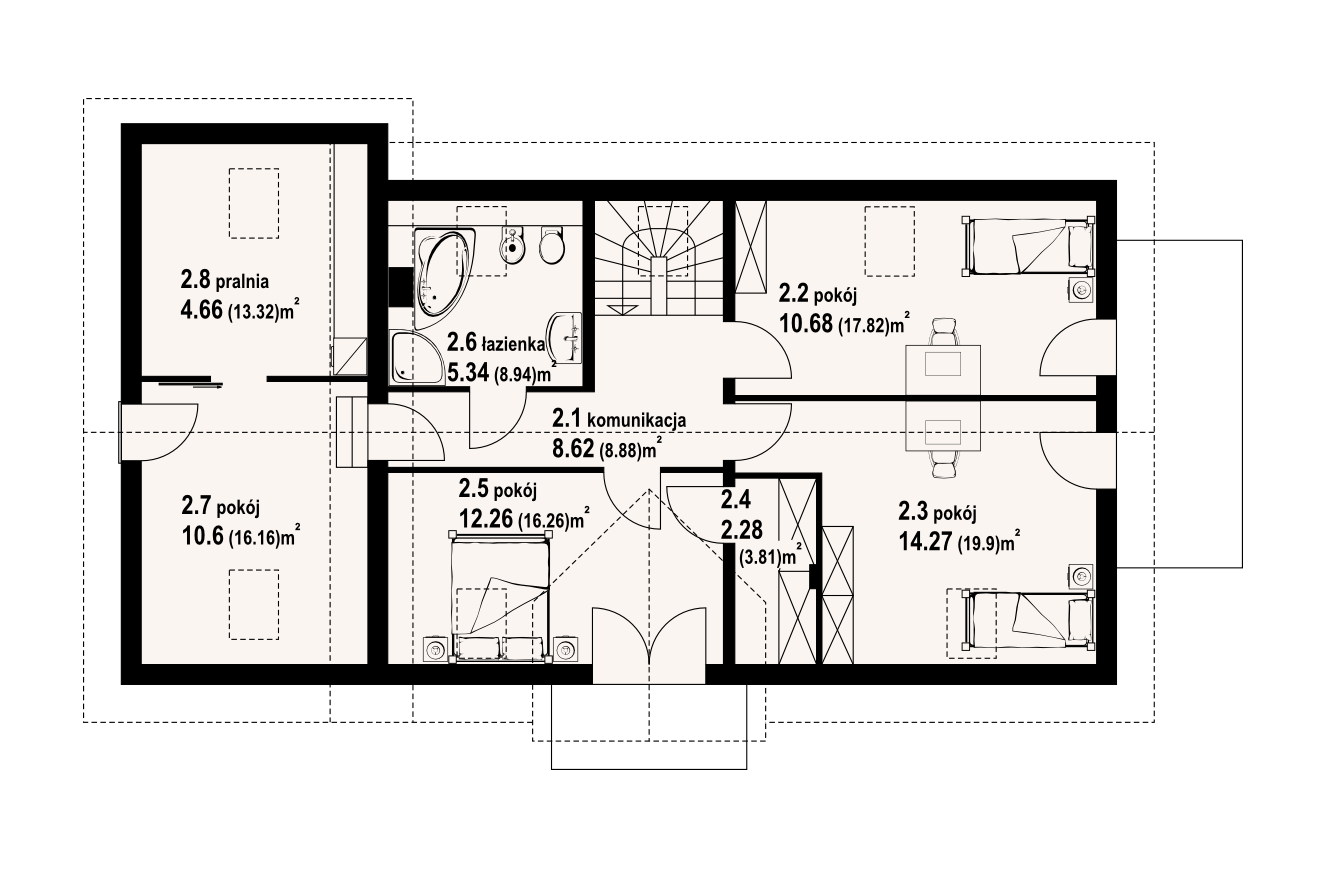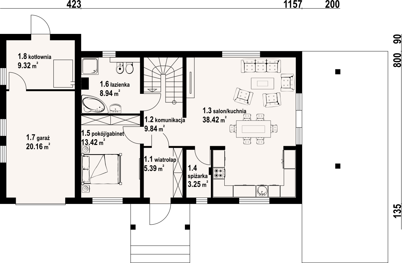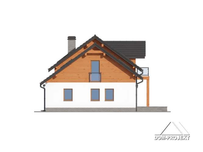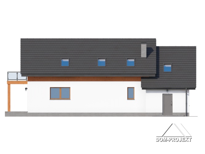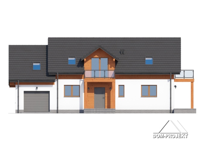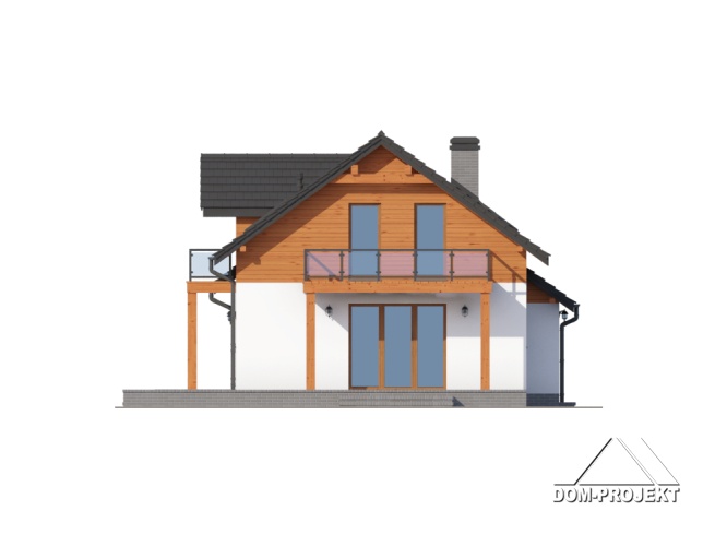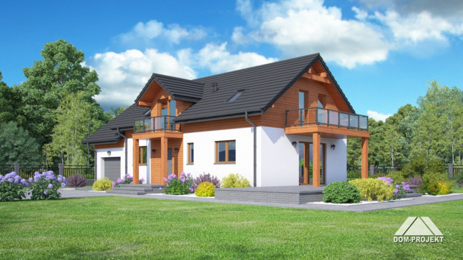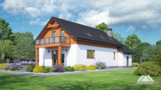 Dom w konstrukcji szkieletu drewnianego. Duży salon z aneksem kuchennym i wyjściem na zadaszony taras. Pokój, gabinet, łazienka, spiżarka, komunikacja, wiatrołap, garaż, kotłownia. Na poddaszu cztery pokoje, łazienka, garderoba, pralnia i balkon. Zwarta bryła buku i dach dwuspadowy sprzyjają szybkiej i taniej budowie i niskim kosztom eksploatacji.