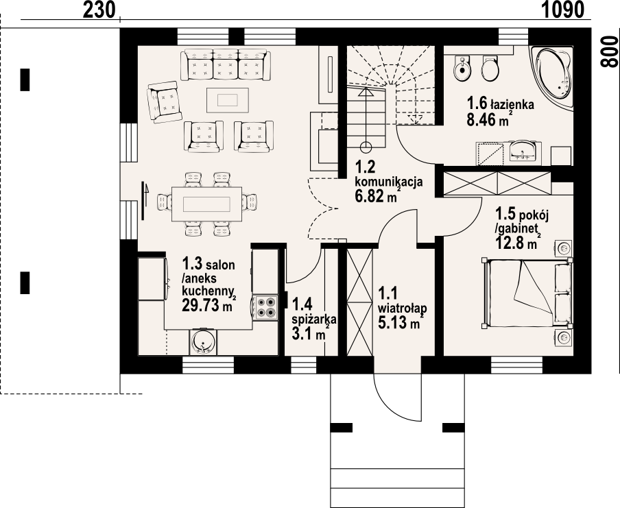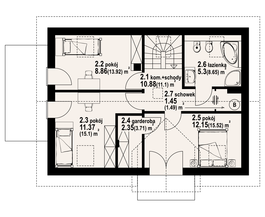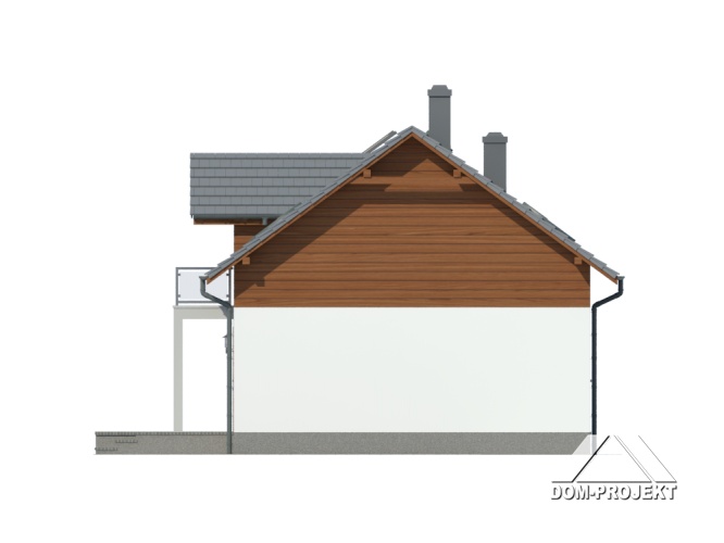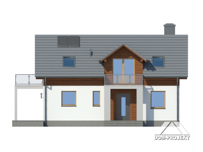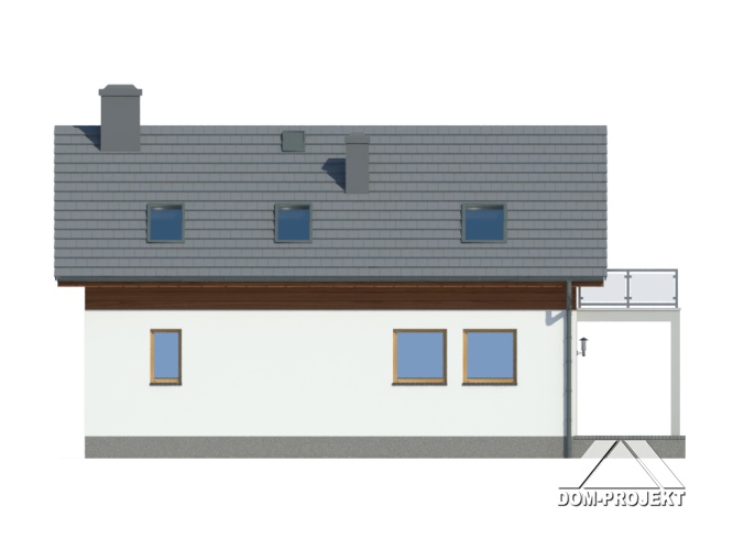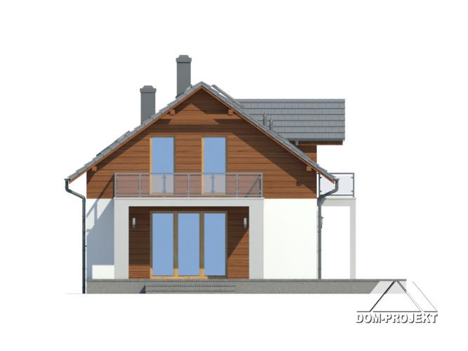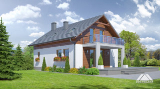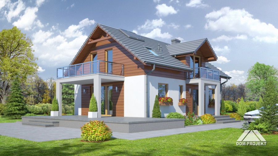 Dom z poddaszem Duży salon z aneksem kuchennym, kominkiem i wyjściem na taras. Pokój, łazienka, wiatrołap, komunikacja i spiżarka. Na poddaszu trzy pokoje, łazienka, garderoba, schowek i komunikacja. Dwa balkony Zwarta bryła budynku i dach dwuspadowy sprzyjają szybkiej i taniej budowie i niskim kosztom eksploatacji.