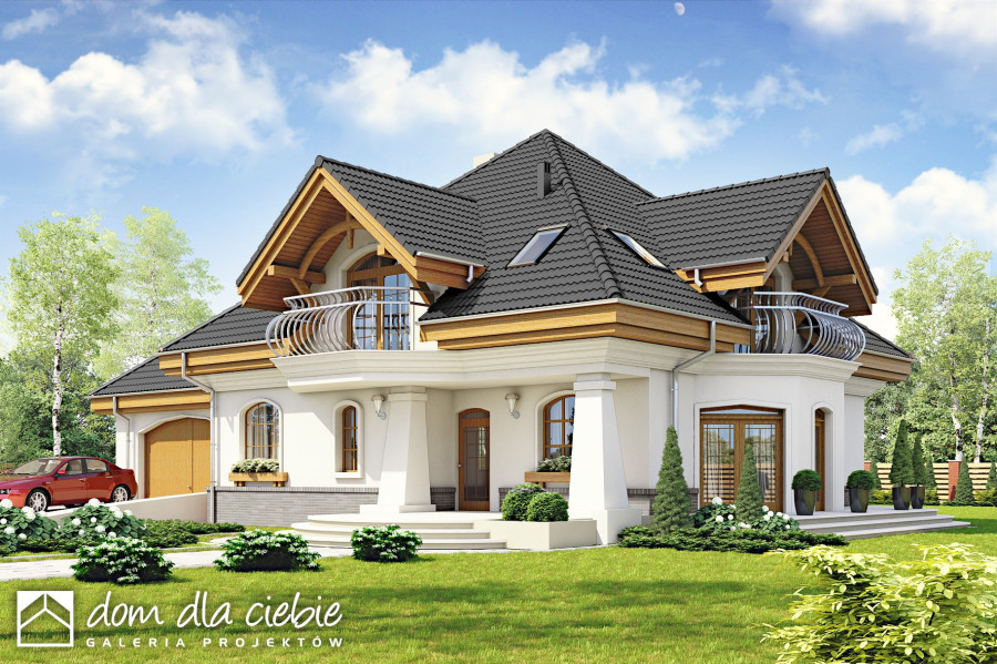 Reprezentacyjny, stylowy i wytworny, rodzinny dom piętrowy dla 5-7-cio osobowej rodziny. Przewidziany układ funkcjonalny rozdziela przestrzeń ogólnodostępną, zlokalizowaną na parterze od części sypialnej, znajdującej się na piętrze. Parter obejmuje salon z kuchnią i jadalnią, pokój gościnny, pokój komputerowy, łazienkę oraz hol ze schodami i wiatrołap. W parterze przewidziano również pomieszczenie techniczne z piecem CO przejściowe do dużego dobudowanego garażu dwustanowiskowego. Piętro dostępne przez wygodne schody to przestrzeń obejmująca hol, cztery wygodne pokoje sypialne oraz dwie łazienki ( jedna połączona z sypialnią rodziców). Przestrzeń nad garażem dostępna przez piętro budynku mieszkalnego przeznacza się na cele gospodarcze.fundamenty: BETONOWE ściany zewnętrzne: POROTHERM+STYROPIAN TERMO ORGANIKA ściany wewnętrzne: POROTHERM/ CEGŁ.DZIURAWKA rodzaj stropu: TERIVA elewacje: TYNK STRUKTURALNY, CEGŁA KLINKIEROWA pokrycie dachu: DACHÓWKA CEM. lub CER.