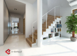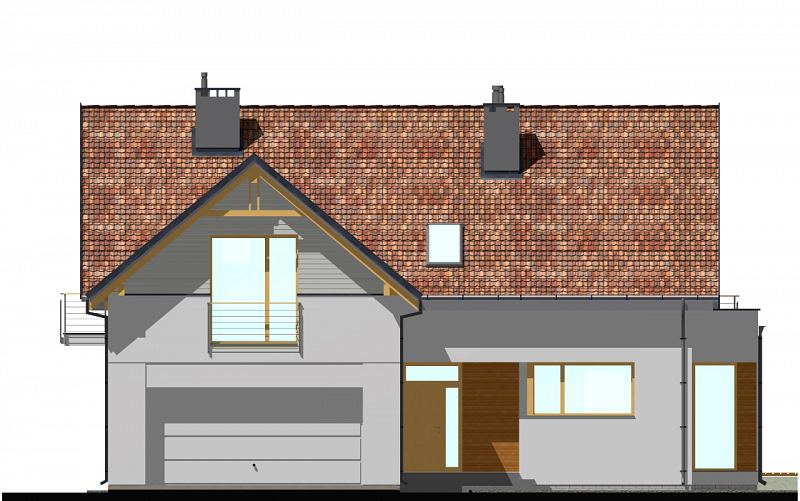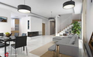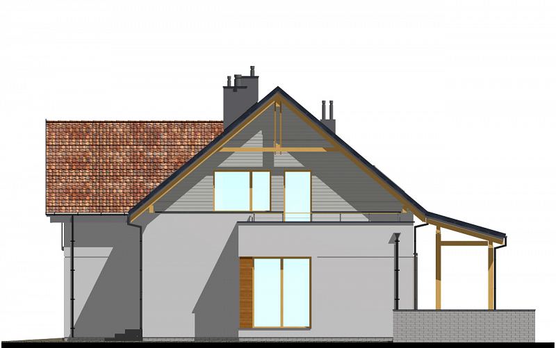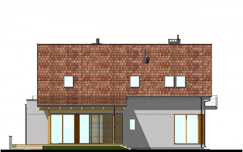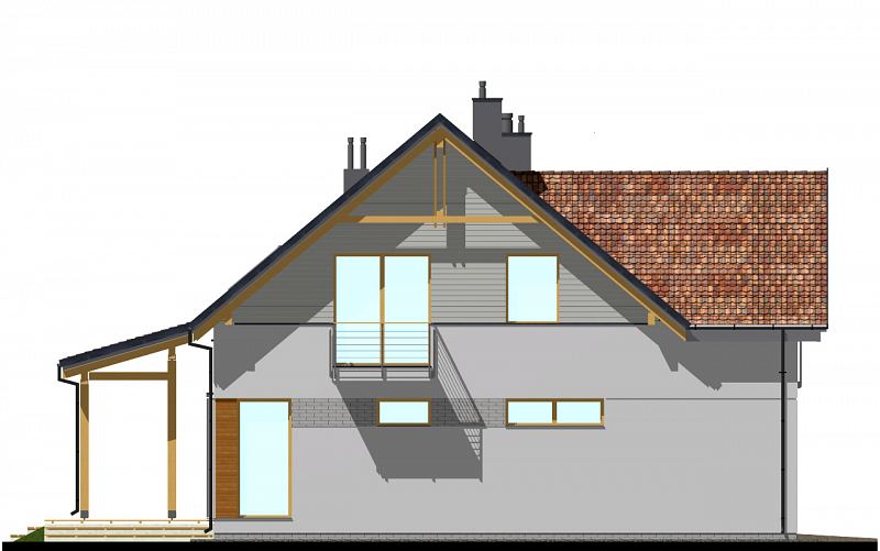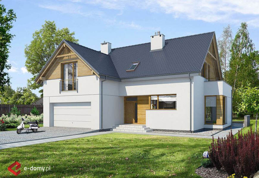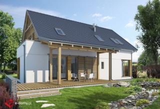 E-103 - dom z poddaszem użytkowym i okapami - to najbardziej tradycyjny projekt z naszej kolekcji. Mimo tradycyjnego charakteru, dom posiada elementy nowoczesnej architektury, takie jak narożne okna i drewniane dodatki na elewacji. Dzięki połączeniu tradycyjnych i nowoczesnych elementów, dom będzie efektownie wyglądał w każdym otoczeniu. Od strony ogrodu zaprojektowano duże zadaszenie nad tarasem. Na parterze zaplanowano przestronny salon z jadalnią i półotwartą kuchnią ze spiżarnią. Znajduje się tu również pokój oraz niewielka łazienka z prysznicem. Na poddaszu (ze ściankami kolankowymi wys. ok. 100cm) znajdują się trzy sypialnie, w tym jedna główna z garderobą oraz osobną łazienką. Dodatkowo na tym poziomie zaplanowano dużą garderobę i łazienkę dla całej rodziny.