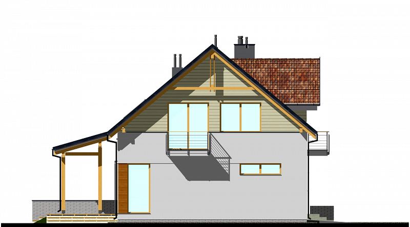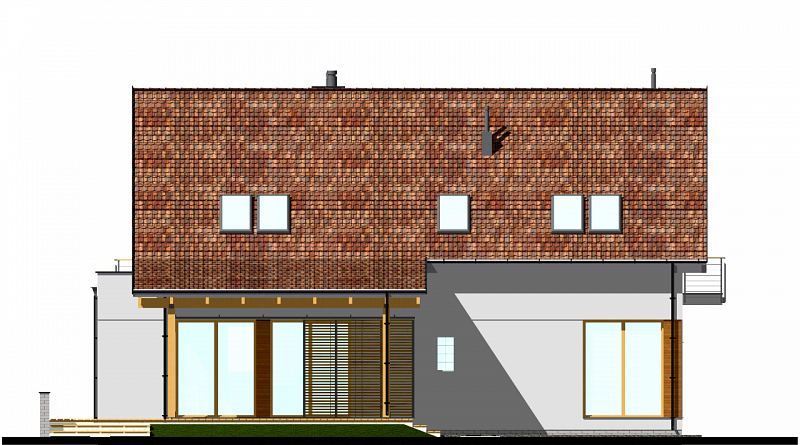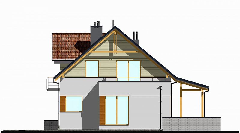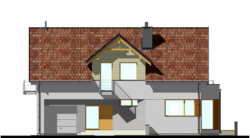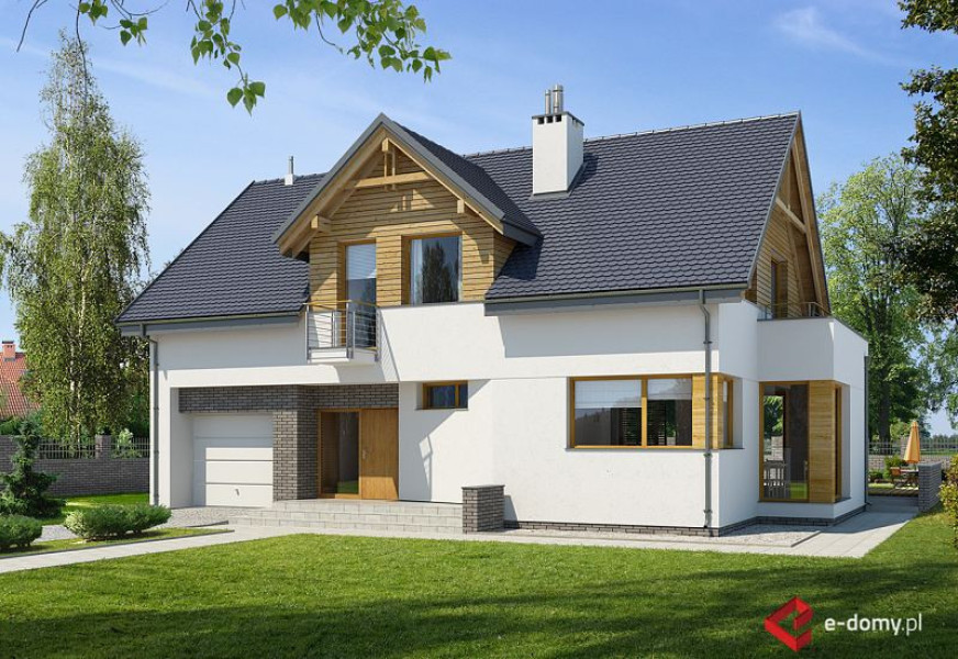 Projekt domu E-104 łączy tradycję z nowoczesnością. Prosta bryła, o ładnych proporcjach, została urozmaicona subtelnym detalem z drewna i klinkieru. Wejście do domu podkreśla skośna, uciekająca ściana na parterze oraz tradycyjna lukarna na poddaszu. Od strony ogrodu zaprojektowano duże zadaszenie nad tarasem. Na parterze zaplanowano duży salon z jadalnią. W centralnym miejscu umieszczono kominek. Z jadalnią graniczy półotwarta kuchnia ze spiżarnią. Na tym poziomie zaprojektowano także dodatkowy pokój z funkcjonalną łazienką. Na poddaszu (ścianka kolankowa h=1m) znajdują się trzy sypialnie oraz łazienka dla całej rodziny. Duża sypialnia posiada własną garderobę i łazienkę.