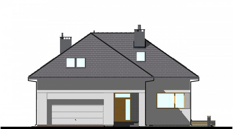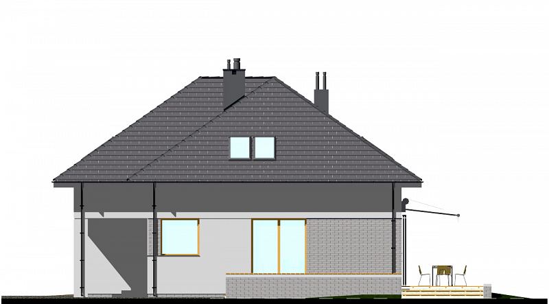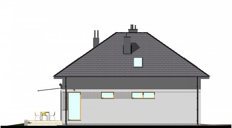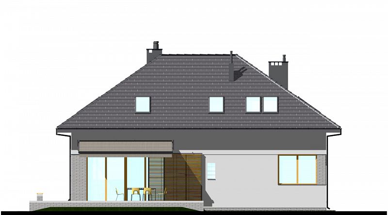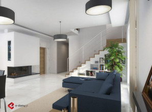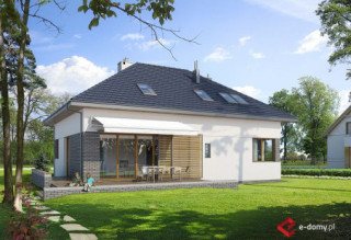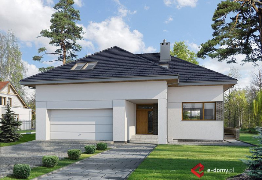 Projekt nowoczesnego domu z czterospadowym dachem i charakterystycznym podcieniem, podkreślającym wejście do domu. Dom E-105 łączy ładną, prostą bryłę z uniwersalnym układem funkcjonalnym. Dach bez lukarn, podkreśla nowoczesny charakter domu, a jednocześnie jest łatwy w budowie. Na parterze zaplanowano przestronny salon z jadalnią. W centralnym miejscu umieszczono kominek. Z jadalnią graniczy półotwarta kuchnia. Na poddaszu (ze ściankami kolankowymi wys. 100cm) znajdują się trzy sypialnie, w tym jedna główna z garderobą, schowkiem i osobną łazienką wyposażoną w prysznic i wannę. Dodatkowo na tym poziomie zaplanowano dużą garderobę i łazienkę dla całej rodziny oraz pralnię.