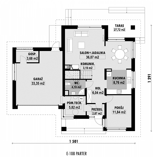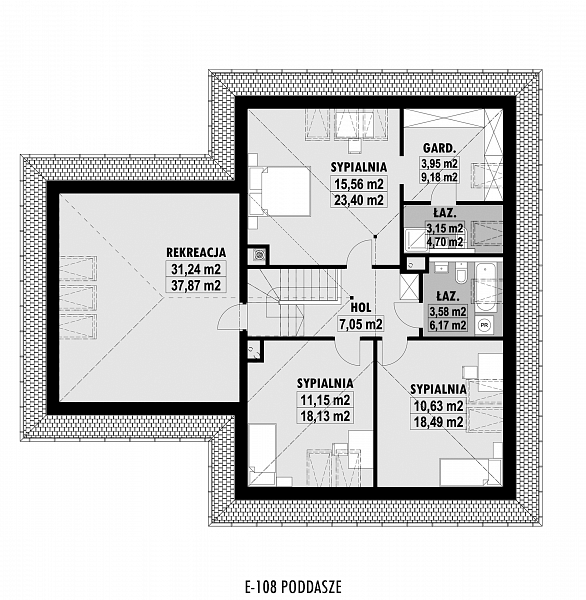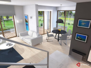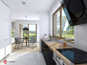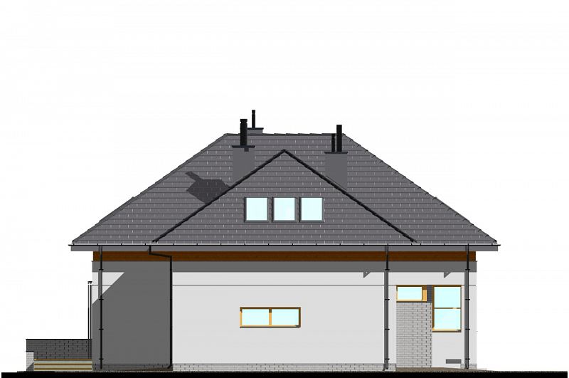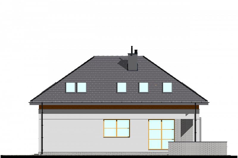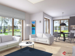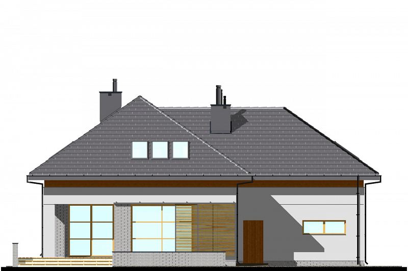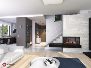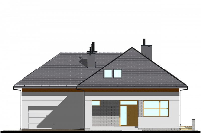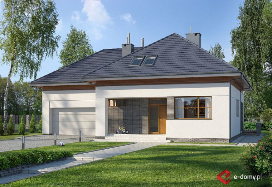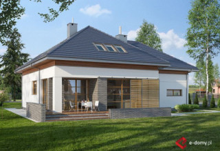 Projekt nowoczesnego domu z uniwersalnym układem funkcjonalnym, z dużym podcieniem wejściowym. Na parterze zaplanowano przestronny salon połączony przestrzennie z jadalnią. Z jadalni przechodzi się do kuchni. Przy wejściu do domu zaplanowano również dodatkowy pokój, który może być wykorzystywany, jako np. pracownia. Na poddaszu (ścianka kolankowa wysokości ok. 110cm) znajdują się trzy sypialnie, w tym jedna główna z garderobą i osobną łazienką, oraz duża łazienka dla reszty rodziny. Dodatkowo nad garażem, zaplanowano duże pomieszczenie rekreacyjne (ścianka kolankowa o wysokości ok. 1,8m), z możliwością przeznaczenia np. na siłownię lub podzielenia na mniejsze części np. pralnię itp.
