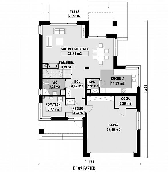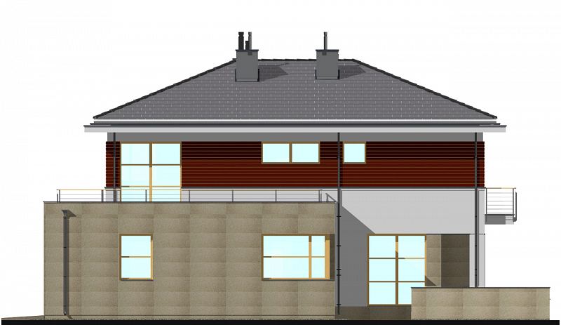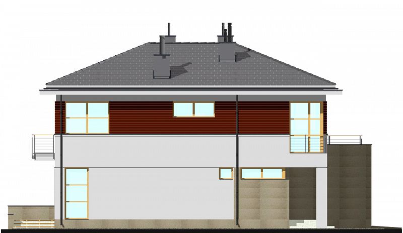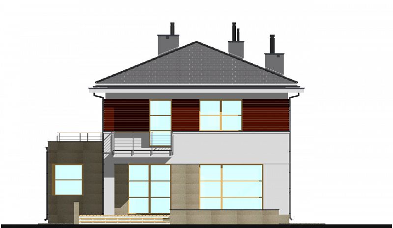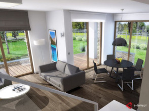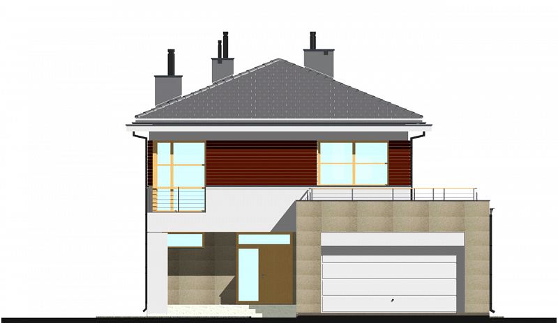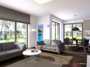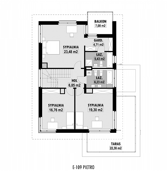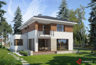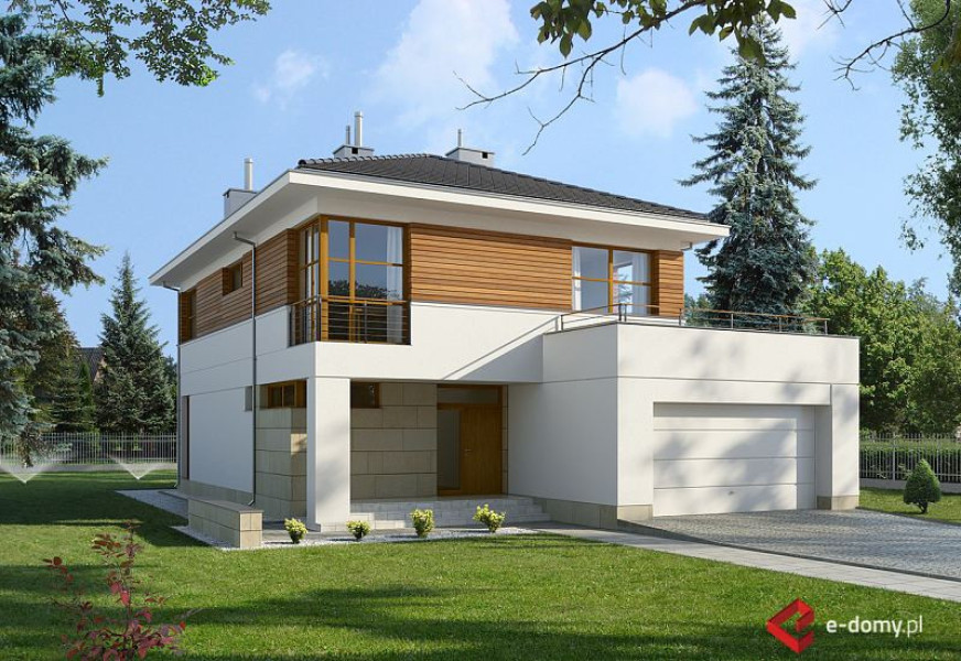 Projekt domu piętrowego z czterospadowym dachem, z dużym dwustanowiskowym garażem, przeznaczonego na wąską działkę. Na parterze zaplanowano przestronny salon z dużą jadalnią. Z jadalni przechodzi się do dużej kuchni. Kuchnię, w zależności od upodobań przyszłych mieszkańców, można wydzielić od salonu i jadalni. Na piętrze znajdują się trzy sypialnie, w tym jedna główna z garderobą, schowkiem i osobną łazienką. Dodatkowo na tym poziomie zaplanowano łazienkę dla reszty rodziny. Nad garażem zaprojektowano duży taras zewnętrzny dostępny z jednej z sypialni. UWAGA: Projekt występuje też w wersji z pojedynczym garażem, jako E-139.