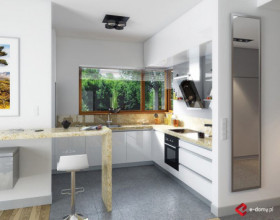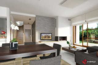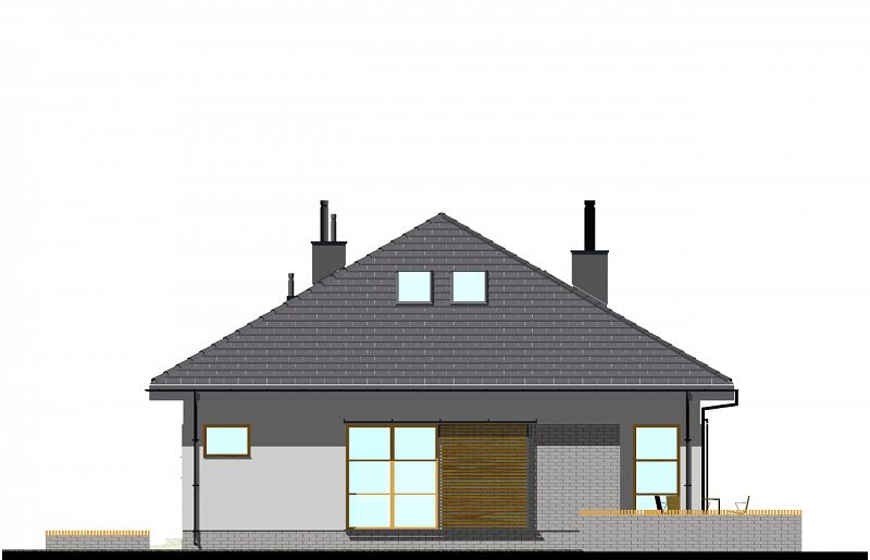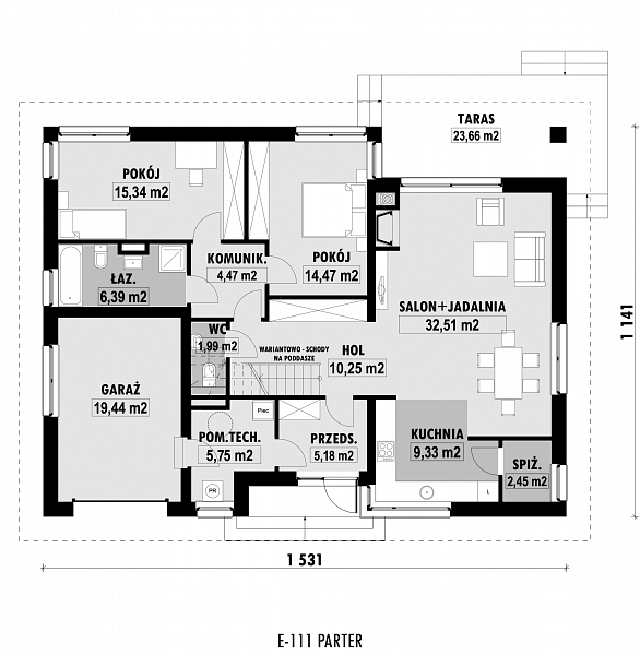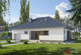 Projekt niewielkiego, nowoczesnego domu z czterospadowym dachem. Dom E-111 to prosta bryła, oparta na rzucie prostokąta i uniwersalny układ funkcjonalny. Czytelny układ funkcjonalny umożliwią podział domu na część dzienną i nocną. Atutem domu jest garaż umieszczony w bryle, oraz bardzo łatwa możliwość zaadaptowania poddasza. W części dziennej zaplanowano salon z jadalnią oraz półotwartą kuchnię ze spiżarnią. W części sypialnej zaplanowano dwie sypialnie, WC oraz łazienkę z wanną i prysznicem. Na poddaszu pokazujemy wariantową powierzchnię możliwą do zaadaptowania. Dla zobrazowania jej wielkości, na rysunku podano powierzchnię netto poddasza, tj. po obrysie ścian. W zakładce \\\"Pliki do pobrania\\\" prezentujemy naszą propozycję podziału poddasza, które można zaadaptować, w ramach adaptacji projektu.