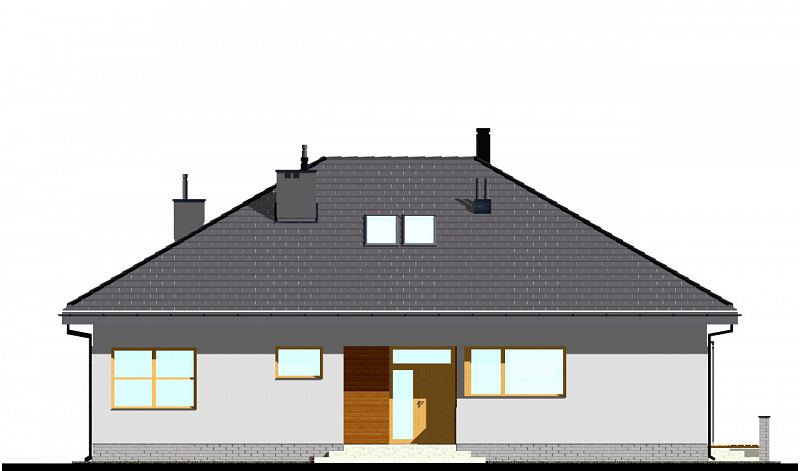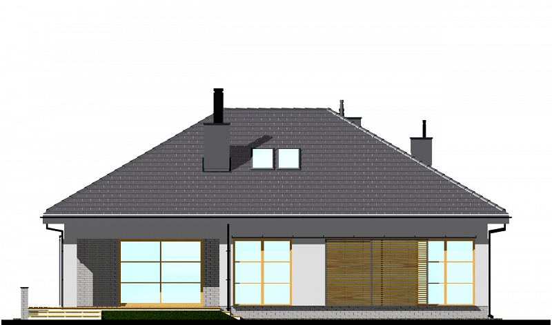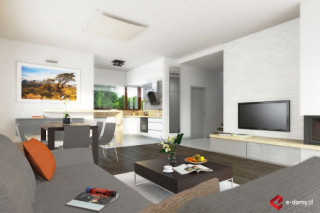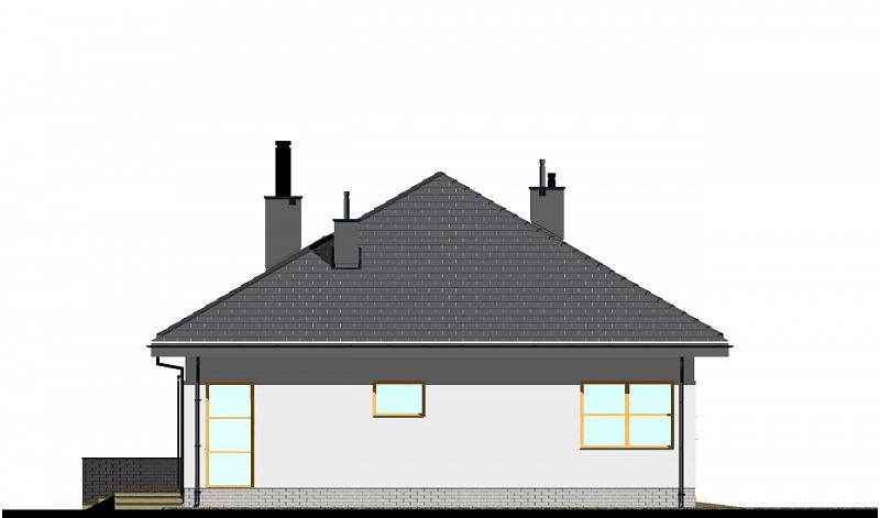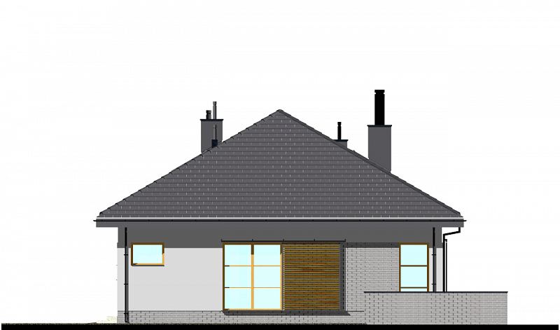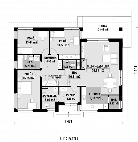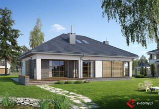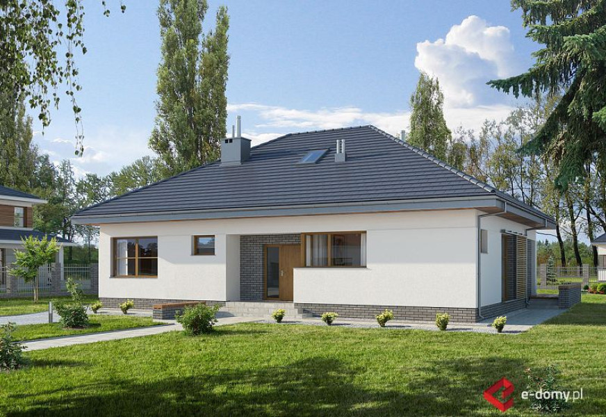 Niewielki, nowoczesny, prosty w budowie dom z czterospadowym dachem. Jest to projekt podobny do domu E-111, ale w miejsce garażu zaproponowaliśmy dodatkowy pokój. Istnieje możliwość dobudowania garażu jedno- lub dwustanowiskowego. W części dziennej zaplanowano salon z jadalnią oraz półotwartą kuchnię ze spiżarnią. W części sypialnej zaplanowano trzy sypialnie, WC oraz łazienkę z wanną i prysznicem. Atutem domu E-112 jest możliwość łatwego zaadaptowania poddasza. Na rzucie pokazano lokalizację schodów.