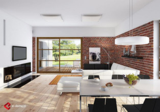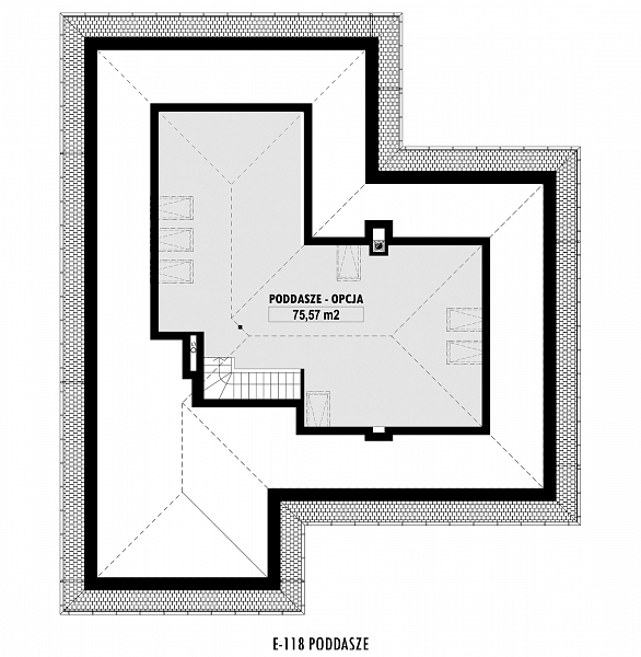 Projekt komfortowego domu E-118 należy do rodziny projektów E-114 do E-119. Prosta bryła połączona z uniwersalnym układem funkcjonalnym i dwustanowiskowym garażem. W części dziennej zaplanowano duży salon z jadalnią (szerszy o 60cm w stosunku do E-115/116) i półotwartą kuchnię ze spiżarnią. W części sypialnej: cztery sypialnie, WC oraz duża łazienka z wanną i prysznicem. Wysokość pomieszczeń parteru wynosi 2,95m. Atutem domu jest też duża garderoba. Na poddaszu pokazujemy powierzchnię możliwą do zaadaptowania. Dla zobrazowania jej wielkości, na rysunku podano powierzchnię netto poddasza, tj. po obrysie ścian.