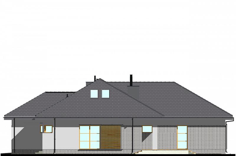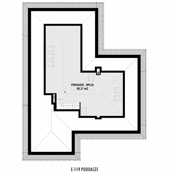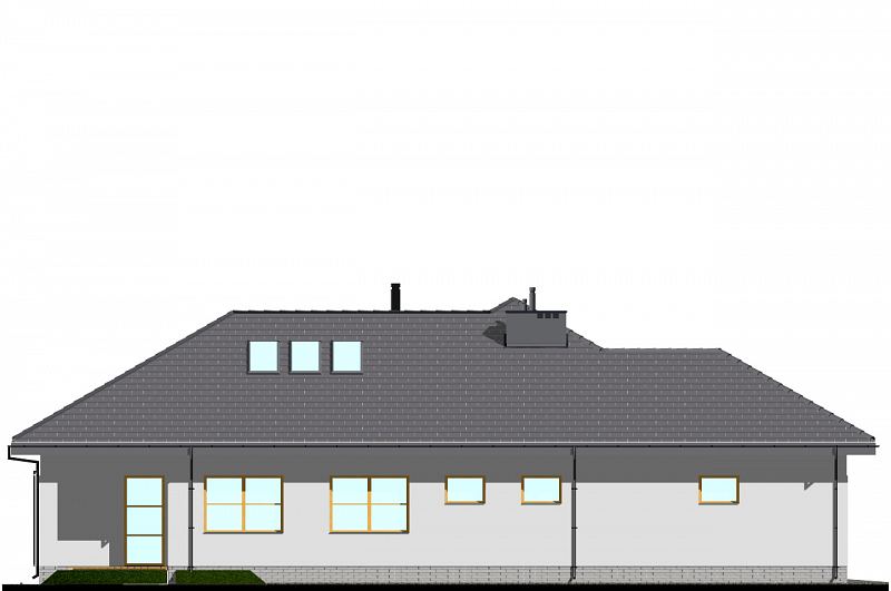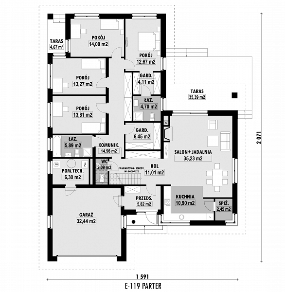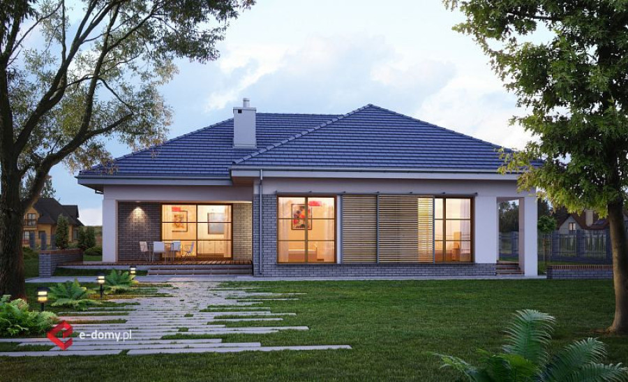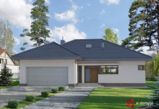 Projekt dużego, nowoczesnego domu z czterospadowym dachem, największego z rodziny projektów E-114 - E-119. Dom E-119 to prosta bryła połączona z rozbudowanym układem funkcjonalnym. W części dziennej zaplanowano salon z jadalnią oraz półotwartą kuchnię ze spiżarnią. Znajduje się tu również WC. W części sypialnej zaplanowano 4 sypialnie (w tym jedną z garderobą oraz łazienką), łazienkę z wanną i prysznicem oraz dużą garderobę, czyli wszystko, co jest niezbędne dla dużej rodziny. Wysokość pomieszczeń parteru wynosi 2,95m. Atutem domu jest bardzo łatwa możliwość zaadaptowania poddasza. Na poddaszu pokazujemy wariantową powierzchnię możliwą do zaadaptowania.