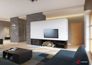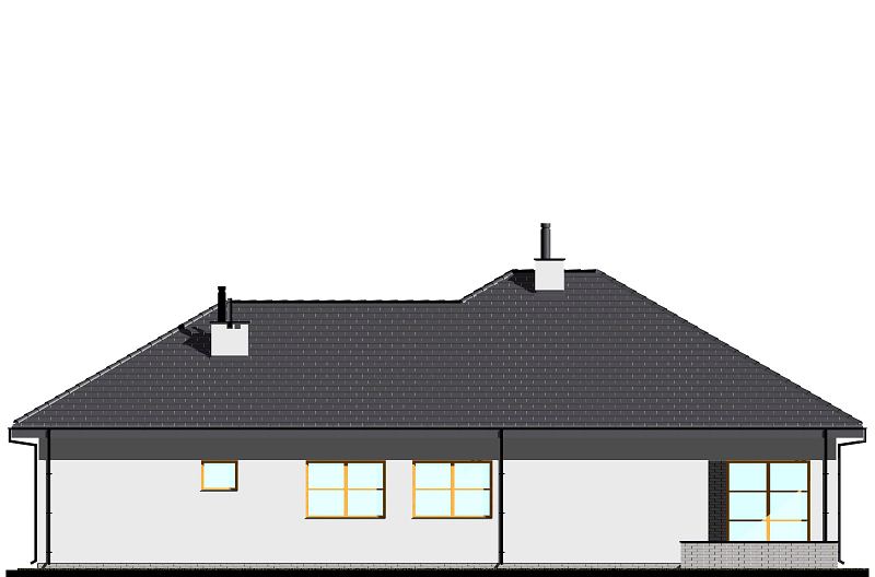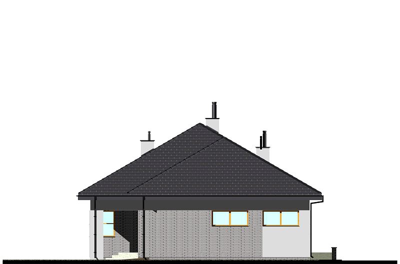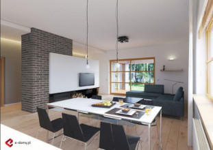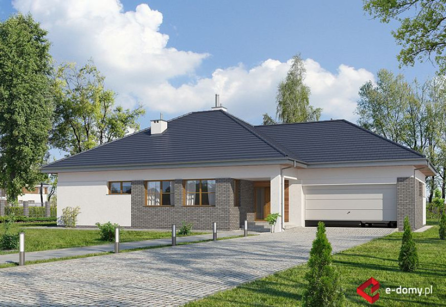 Projekt nowoczesnego domu z dwustanowiskowym garażem. W części dziennej zaplanowano salon z jadalnią oraz półotwartą kuchnię ze spiżarnią. Część sypialną oddzielono od części dziennej ścianą o wysokości 2,2m. Dzięki temu wnętrze domu jest bardzo przestronne. W części sypialnianej zaplanowano trzy sypialnie oraz 2 łazienki z wanną i prysznicem. Wysokość pomieszczeń parteru wynosi 2,95m. Istnieje możliwość łatwego zaadaptowania poddasza. Na rzucie pokazano proponowaną lokalizację schodów. W wersji na wąską działkę, proponujemy podobny projekt domu tj. E-121.