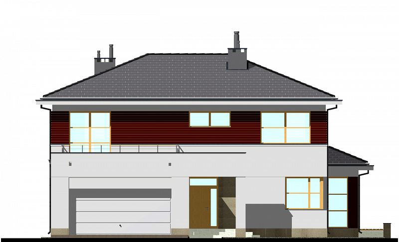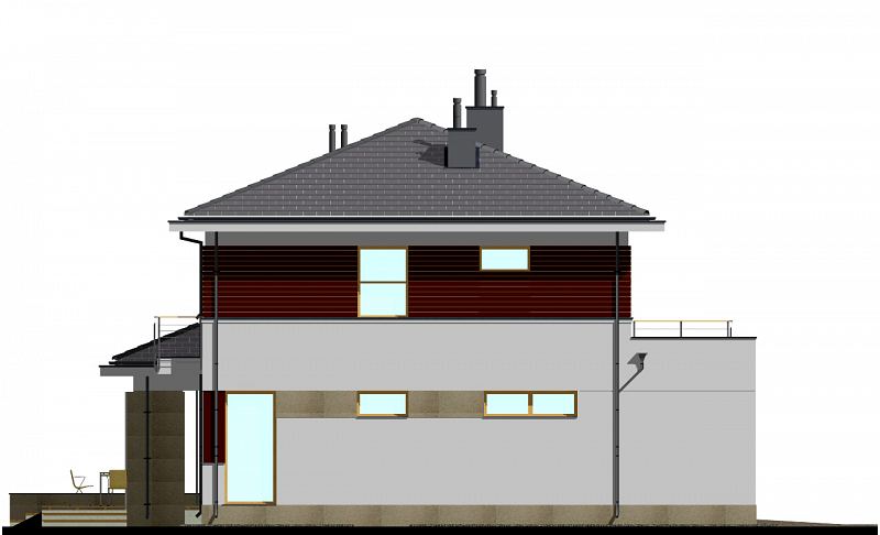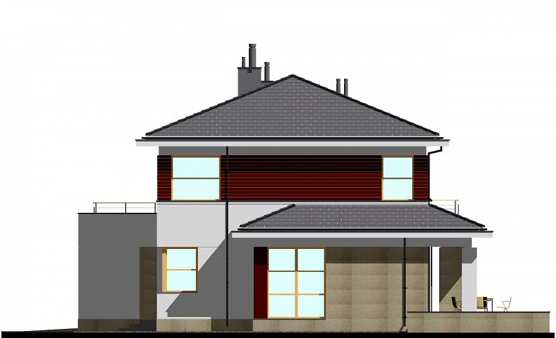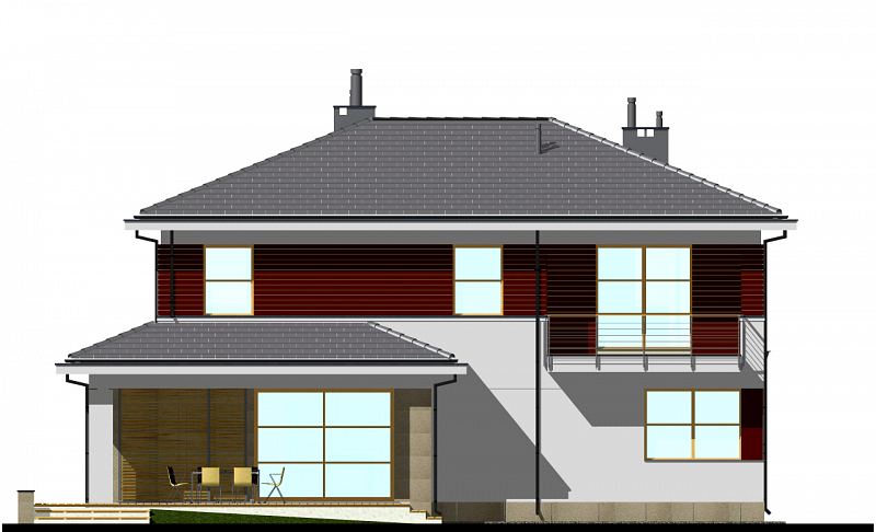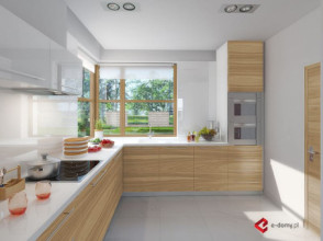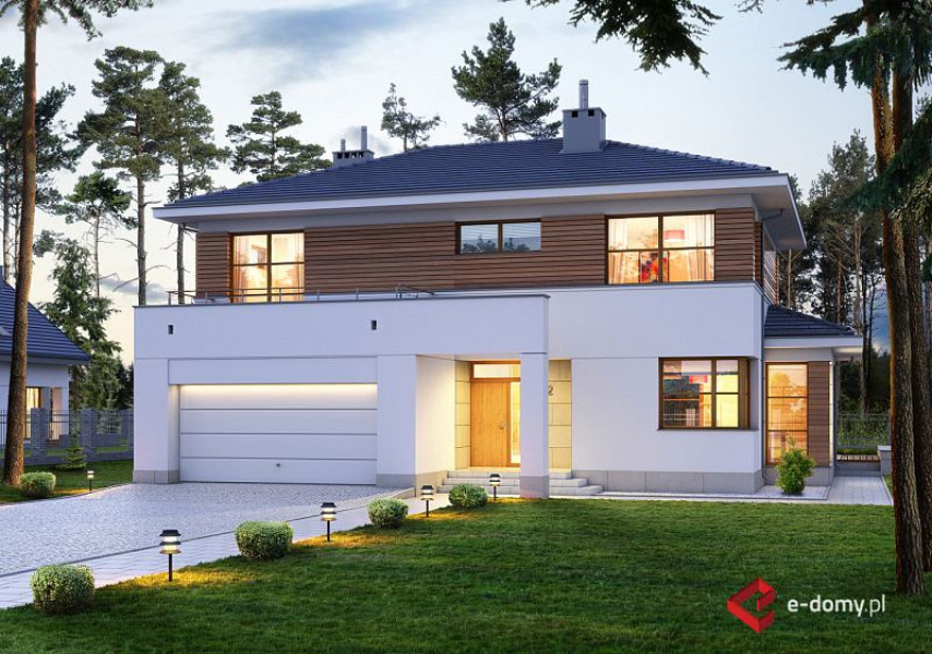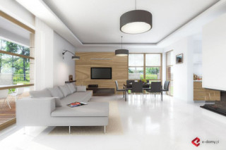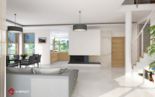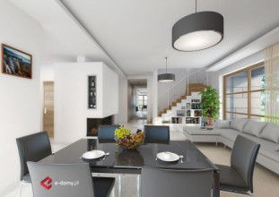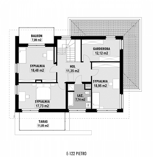 E-122 to projekt domu z pełnowymiarowym piętrem. Jest to zmniejszona wersja projektu E-106, z tarasem przy sypialni na piętrze. Dzięki użyciu m.in. kamienia i drewna, dom prezentuje się jak elegancka rezydencja. Na parterze zaplanowano przestronny salon z jadalnią. W centralnym miejscu umieszczono kominek. Z jadalnią graniczy półotwarta kuchnia ze spiżarnią. Na parterze zaplanowano również dodatkowy pokój z niewielką łazienką z prysznicem. Na piętrze znajdują się trzy sypialnie. Na tym poziomie znajduje się również duża garderoba i łazienka dla całej rodziny.