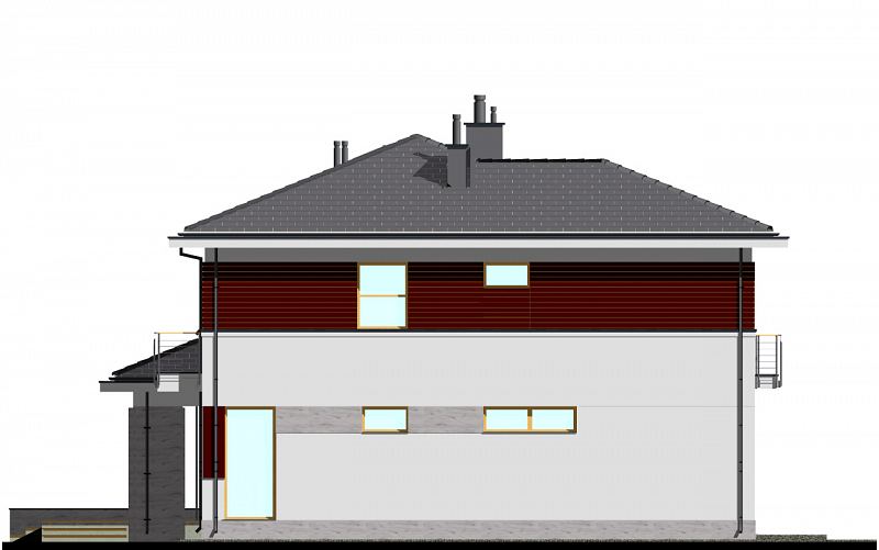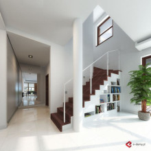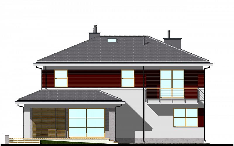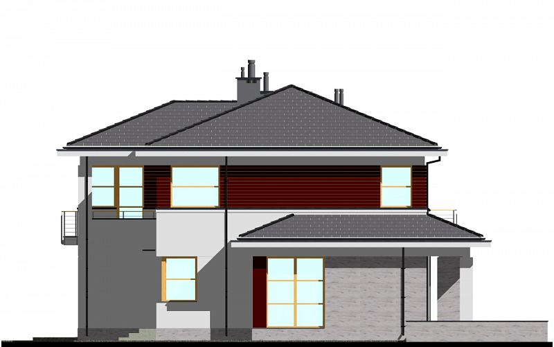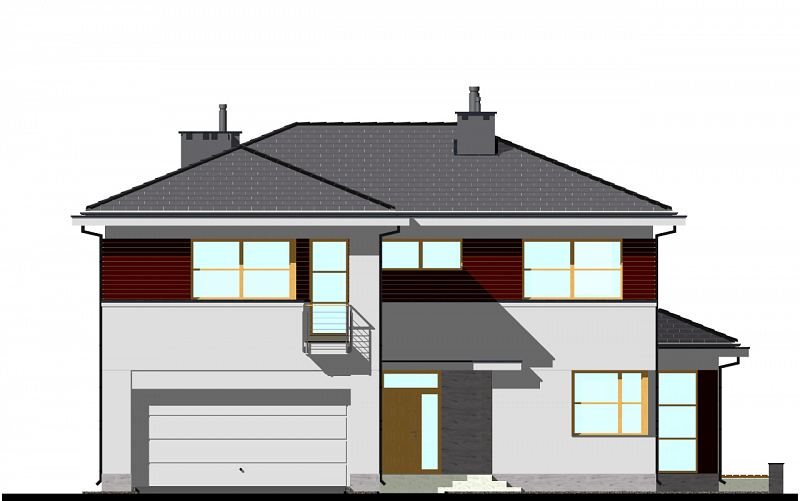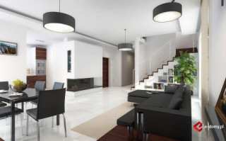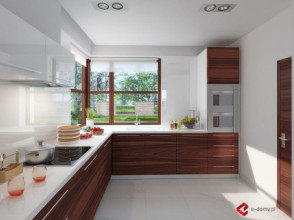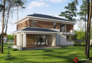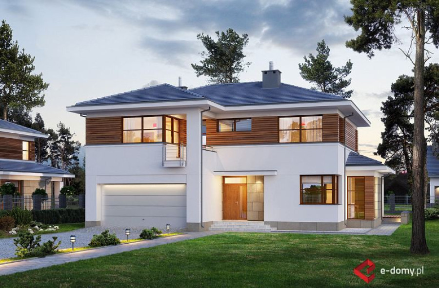 E-123 to nieco powiększona wersja projektu E-122, z dodatkową z łazienką i garderobą przy sypialni na piętrze, kosztem tarasu nad garażem. Na parterze zaplanowano przestronny salon z jadalnią. W centralnym miejscu umieszczono kominek. Z jadalnią graniczy półotwarta kuchnia ze spiżarnią. Na parterze zaplanowano również dodatkowy pokój z niewielką łazienką z prysznicem. Na piętrze znajdują się trzy sypialnie, jedna z łazienką i garderobą oraz duża garderoba i łazienka dla całej rodziny.