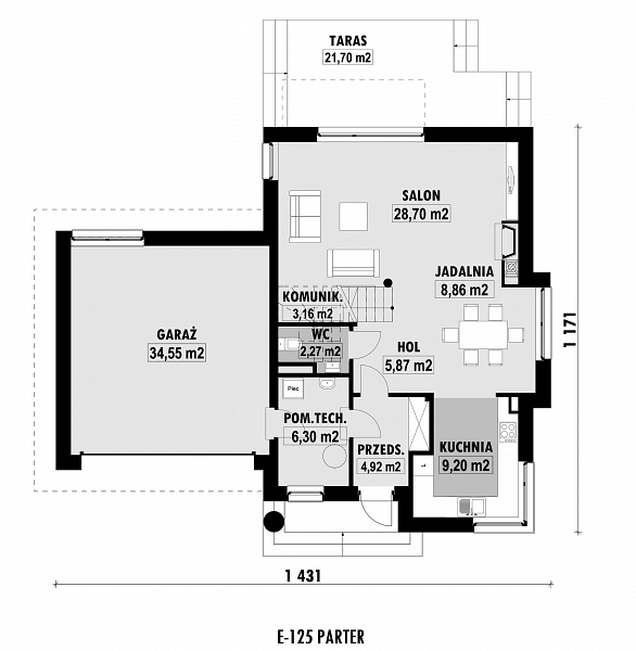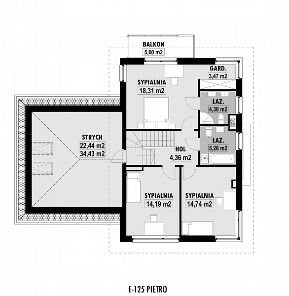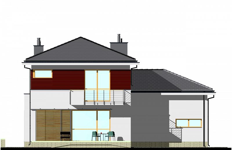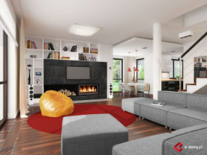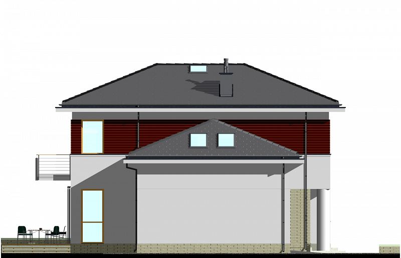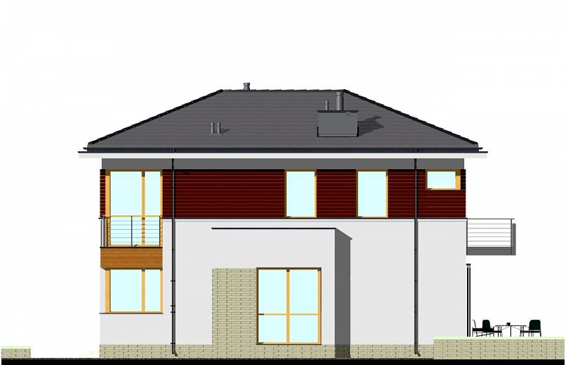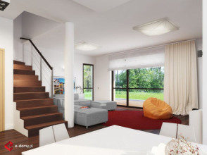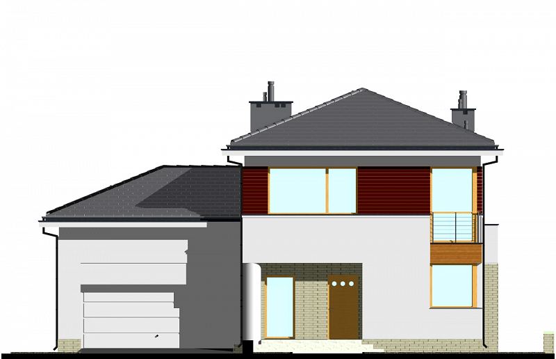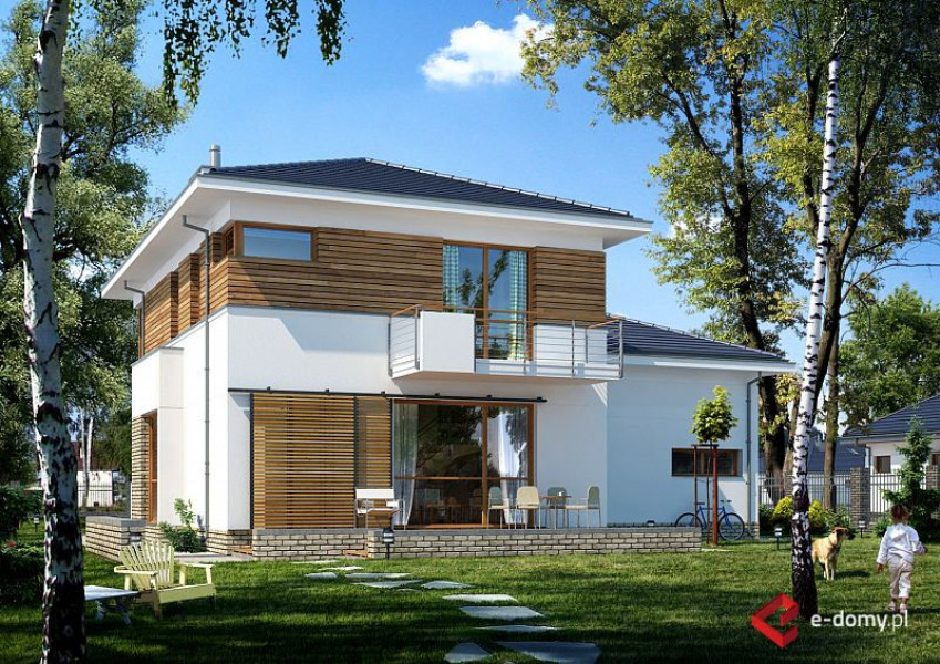 Projekt niedużego, nowoczesnego domu piętrowego z dwustanowiskowym garażem. W części dziennej zaplanowano salon z jadalnią z małym wykuszem oraz kuchnię od strony wejścia. W części sypialnej na piętrze zaplanowano trzy sypialnie, w tym jedną z łazienką i garderobą. Dodatkowo zaplanowano dużą łazienkę z wanną.