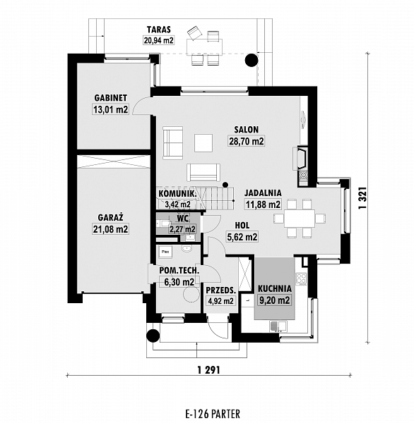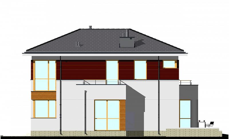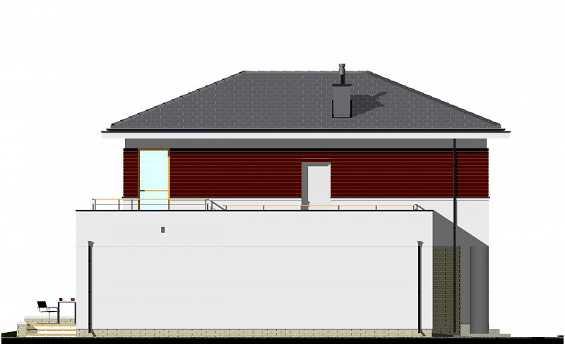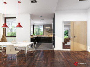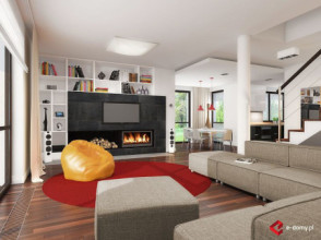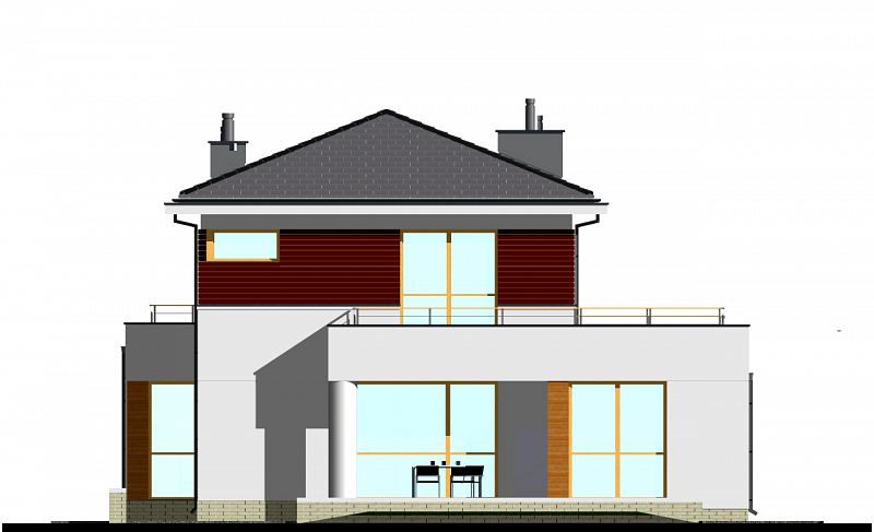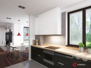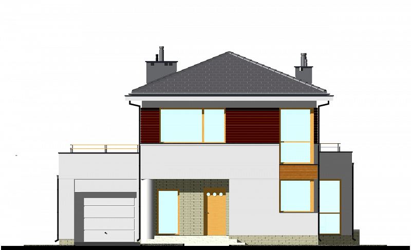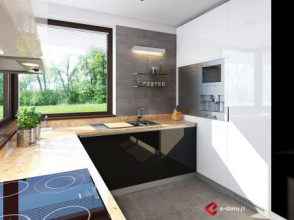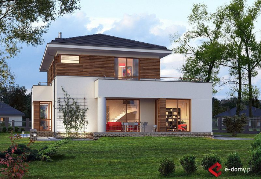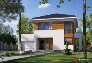 Projekt niedużego, nowoczesnego domu piętrowego z jednostanowiskowym garażem. W części dziennej zaplanowano salon z jadalnią w wykuszu oraz kuchnię od strony wejścia. Od strony ogrodu przewidziano duży gabinet do pracy. W części sypialnej, na piętrze, zaplanowano trzy sypialnie, w tym jedną z łazienką i garderobą oraz wspaniałym dużym tarasem. Dodatkowo zaplanowano dużą łazienkę z wanną.
