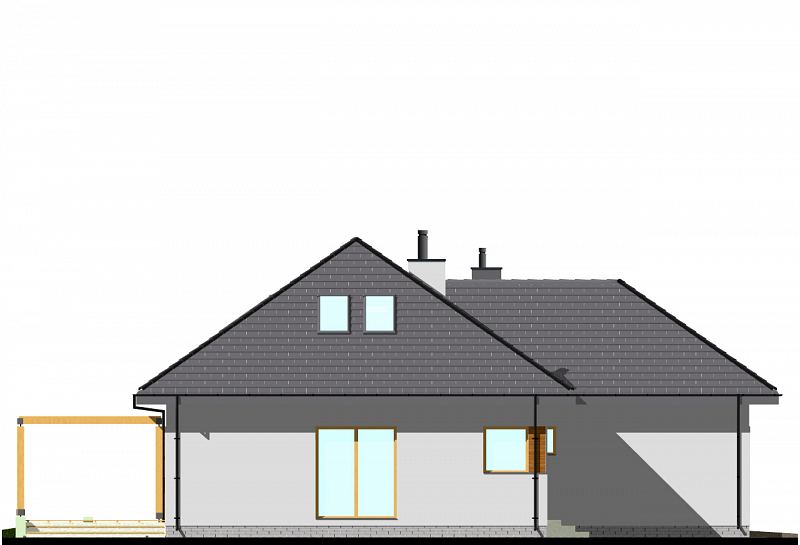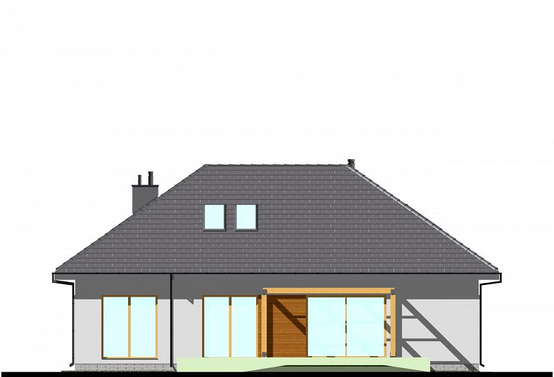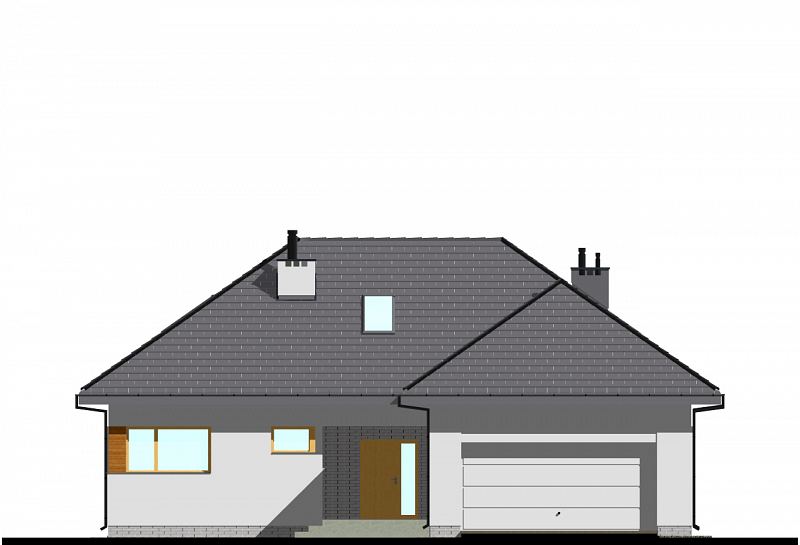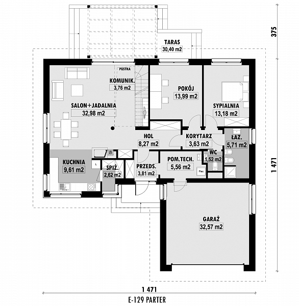 Projekt jest rozbudowaną wersją projektu E-117, z dwustanowiskowym garażem. W części dziennej zaplanowano salon oraz kuchnię ze spiżarnią, a w części sypialnej na parterze zaplanowano dwie sypialnie, WC i łazienkę. Zaplanowano częściową pustkę na salonem, oznaczoną na rzucie liniami przerywanymi. Na drugiej kondygnacji salon jest otwarty na antresolę, gdzie zaaranżowano przestrzeń do pracy. W części sypialnianej zaprojektowano dwie sypialnie i małą łazienkę.