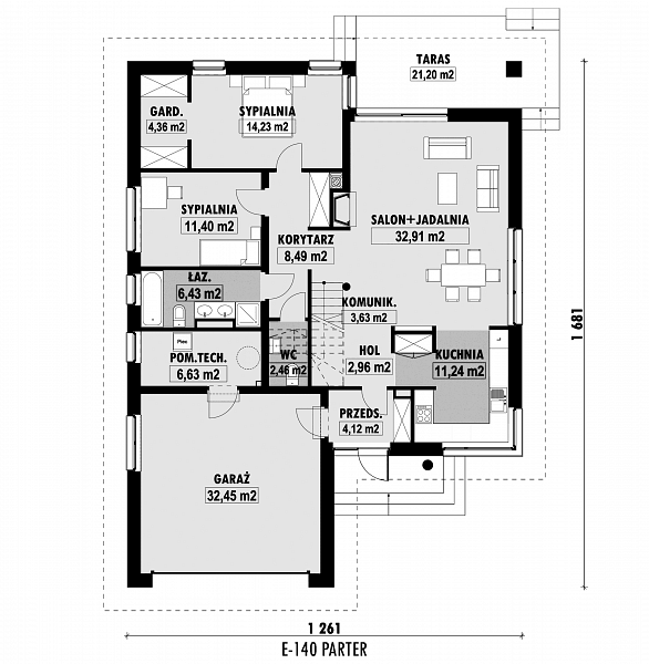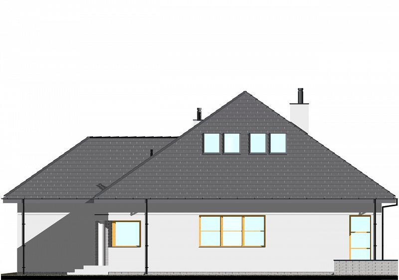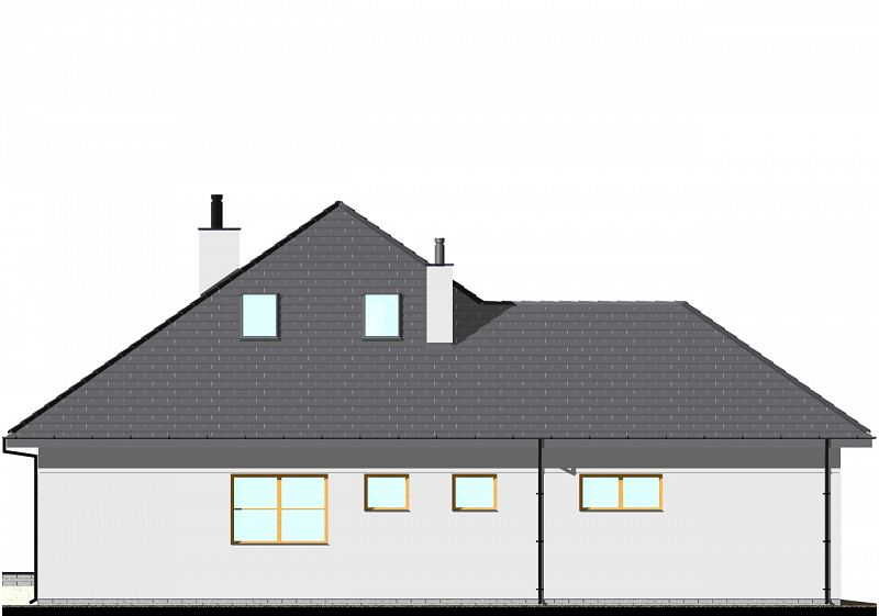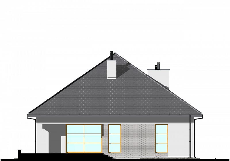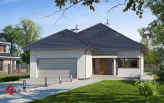 Projekt nowoczesnego domu z dwustanowiskowym garażem, na wąską działkę. Na parterze, w części dziennej zaplanowano duży salon z jadalnią oraz kuchnię. Na parterze znajduje się też sypialnia z garderobą oraz dodatkowy pokój, który można wykorzystać do pracy lub jako sypialnię. W części sypialnianej, na poddaszu zaplanowano dwie sypialnie, dużą garderobę oraz łazienkę z wanną.