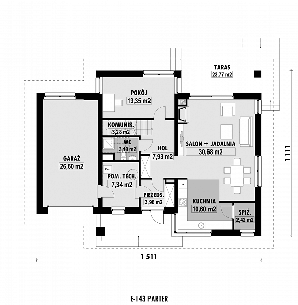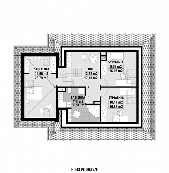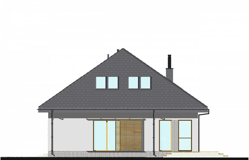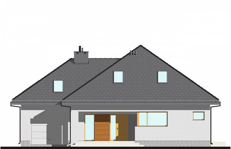 Projekt domu z poddaszem o kącie nachylenia połaci 35 stopni, z salonem połączonym z dużą kuchnią z jadalnią. Dodatkowy pokój na parterze można wykorzystać do pracy lub jako sypialnię. Na poddaszu zostały zlokalizowane trzy sypialnie oraz duża wspólna łazienka z narożną wanną.