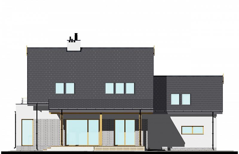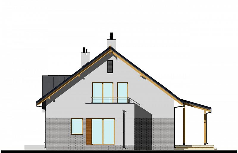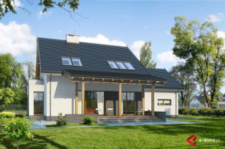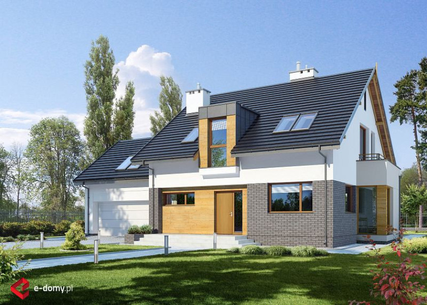 Klasyczny dom z dwuspadowym dachem i w pełni użytkowym poddaszem. Elewacja frontowa zaakcentowana została wykuszem o nowoczesnej architekturze. Na parterze zaprojektowana została przestronna i ustawna kuchnia, w której znalazło się miejsce na stół śniadaniowy lub barek. Jadalnia z szerokim stołem zorganizowana została w dobrze doświetlonym wykuszu. Z wygodnego salonu możliwy jest dostęp do dodatkowego pokoju, który może pełnić rolę biblioteki. Na poddaszu znajdują się trzy sypialnie oraz wygodna łazienka i garderoba a także przestrzeń strychowa nad garażem.
