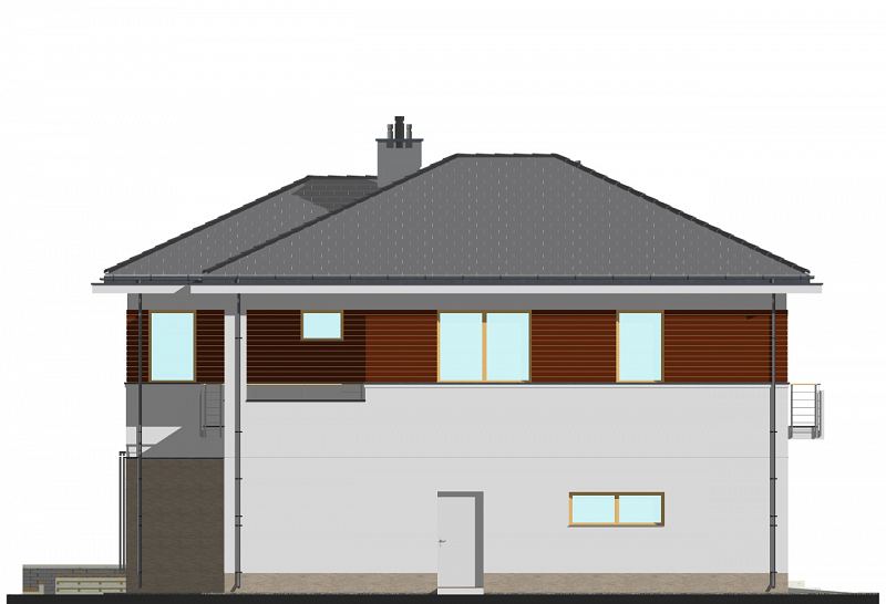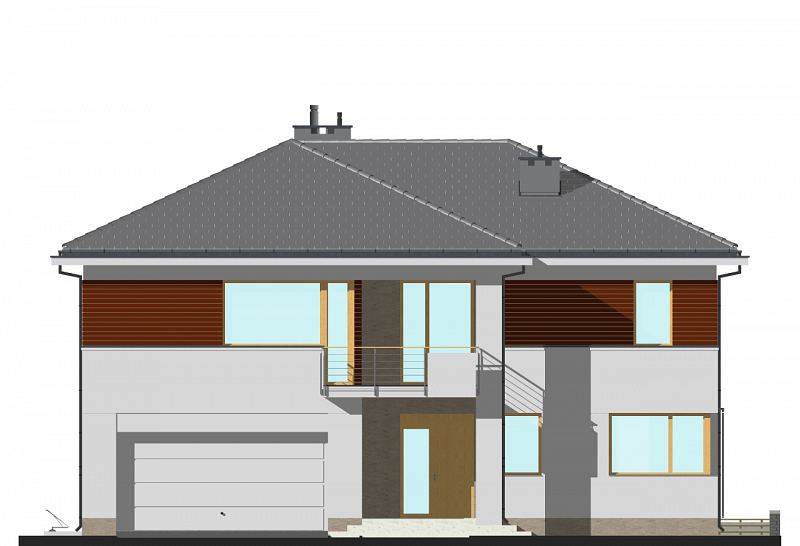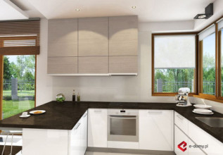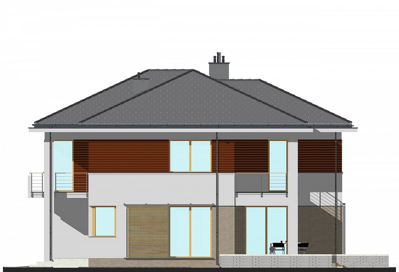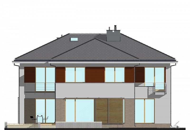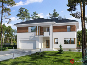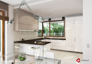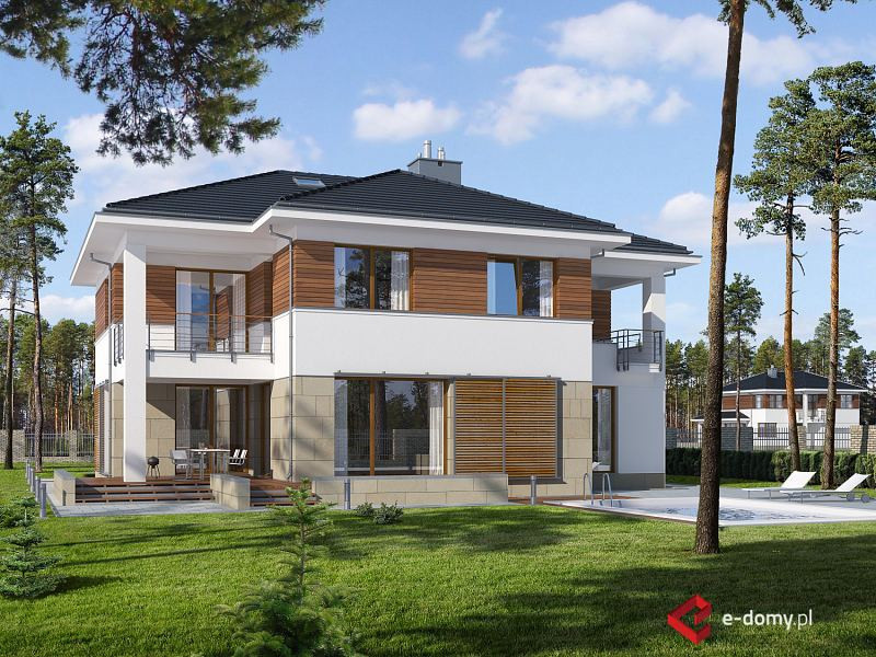 Duża rezydencja o zwartej bryle. W części dziennej znajdują się: salon z aneksem bibliotecznym, zlokalizowanym od strony ogrodu oraz wydzielona kuchnia i jadalnia. Istnieje możliwość wyjścia na zadaszony taras, zarówno z salonu jak i z jadalni. Przy kuchni zlokalizowano dużą spiżarnię, a przy garażu dodatkowe pom. gospodarcze. W części sypialnej na piętrze zaplanowano cztery sypialnie, w tym jedną „rodziców”, od strony ogrodu z łazienką i garderobą. Dodatkowo na piętrze znajduje się wspólna łazienka z wanną i prysznicem z wydzieloną przestrzenią na pralnię. Wszystkie sypialnie mają dostęp do tarasu lub balkonu.