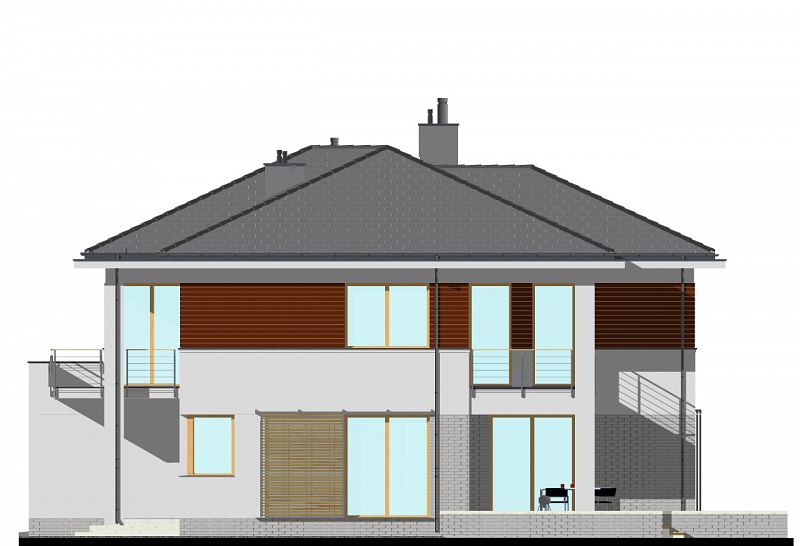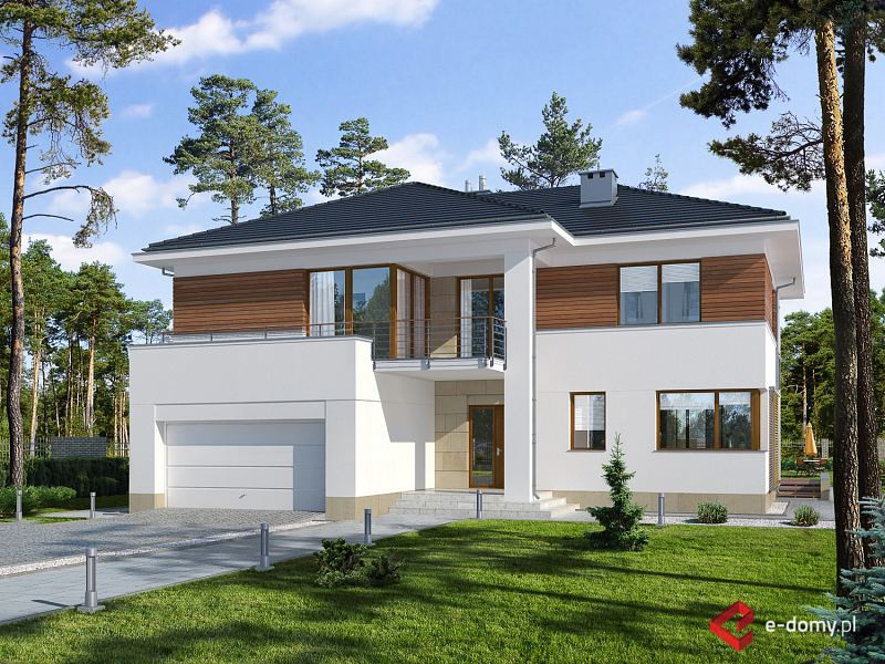To największa rezydencja z naszej kolekcji. W projekcie zwraca uwagę duży przestronny salon o powierzchni ok. 36m2 połączony z aneksem bibliotecznym. Taras dzięki dużemu zadaszeniu i wyjściu zarówno z salonu jak i jadalni, staje się częścią wnętrza domu. Na parterze zaprojektowano także WC oraz spiżarnię, do których wejście ukryto pod schodami. Na piętrze umieszczono 4 sypialnie, w tym jedną główną z prywatną łazienką i garderobą. Dla pozostałych użytkowników zaprojektowano dużą, wspólną łazienkę i garderobę oraz pomieszczenie na pralnię.