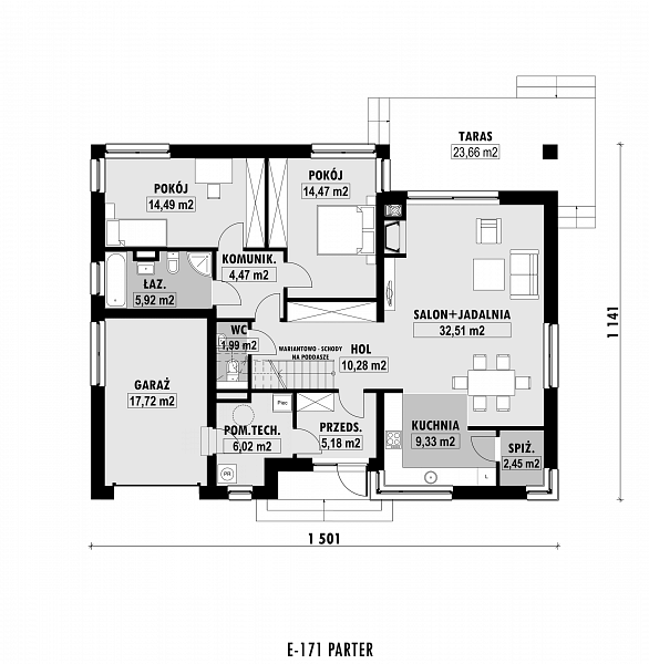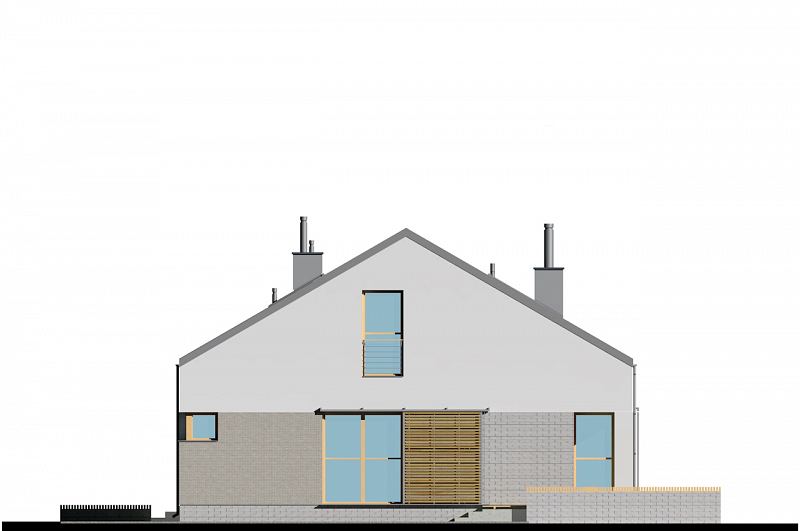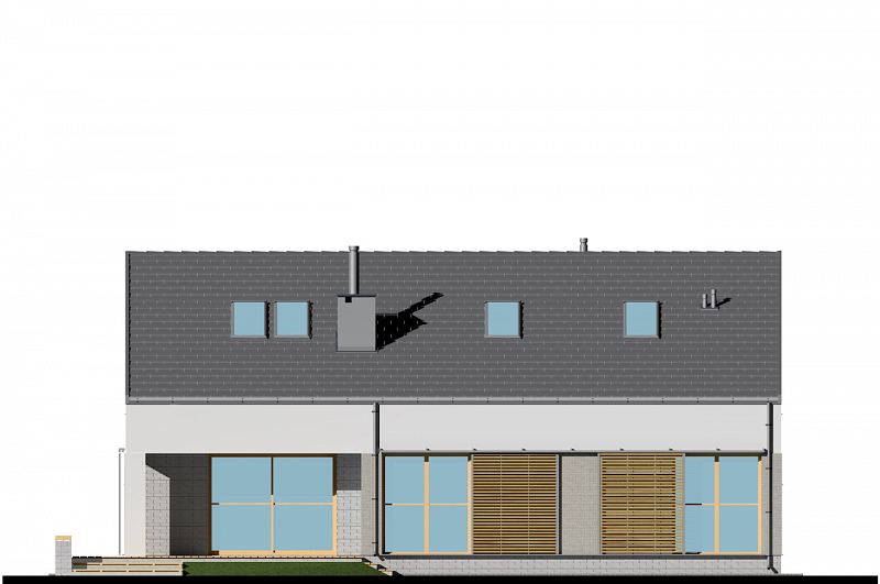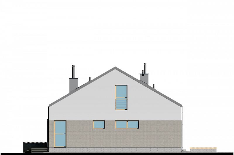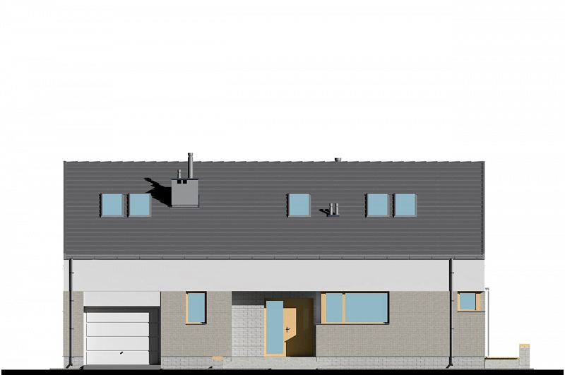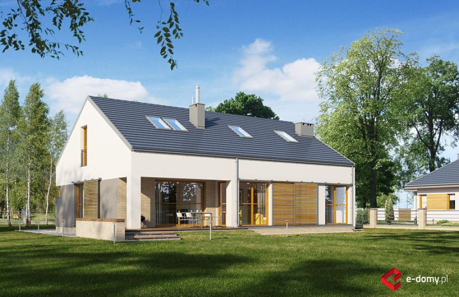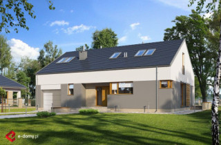 Projekt jest unowocześnioną wersją projektu E-111 z bezokapowym dachem dwuspadowym. Prosta bryła, oparta na rzucie prostokąta. Czytelny układ funkcjonalny umożliwia podział domu na dwie części. W części dziennej zaplanowano salon z jadalnią oraz półotwartą kuchnię ze spiżarnią, natomiast w części sypialnej dwie sypialnie, WC oraz łazienkę z wanną i prysznicem. Atutem domu jest garaż umieszczony w bryle, oraz bardzo łatwa możliwość zaadaptowania poddasza.