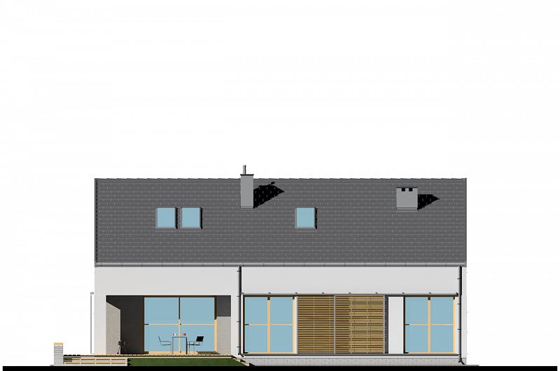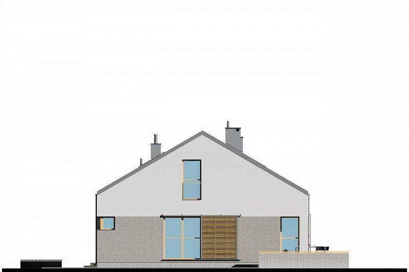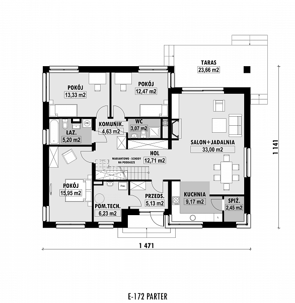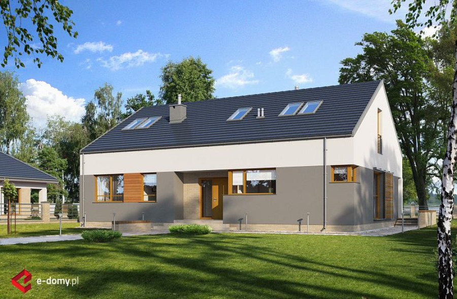 Nowoczesny, nieduży i prosty w budowie dom z dwuspadowym dachem. Jest to projekt podobny do domu E-171, ale w miejsce garażu zaprojektowano dodatkowy pokój. Istnieje możliwość dobudowania jedno- lub dwustanowiskowego garażu. W części dziennej zaplanowano salon z jadalnią oraz półotwartą kuchnię ze spiżarnią. W części nocnej trzy sypialnie, WC oraz łazienkę z wanną i prysznicem. Atutem domu jest możliwość łatwego zaadaptowania poddasza. Na rzucie pokazano lokalizację schodów.