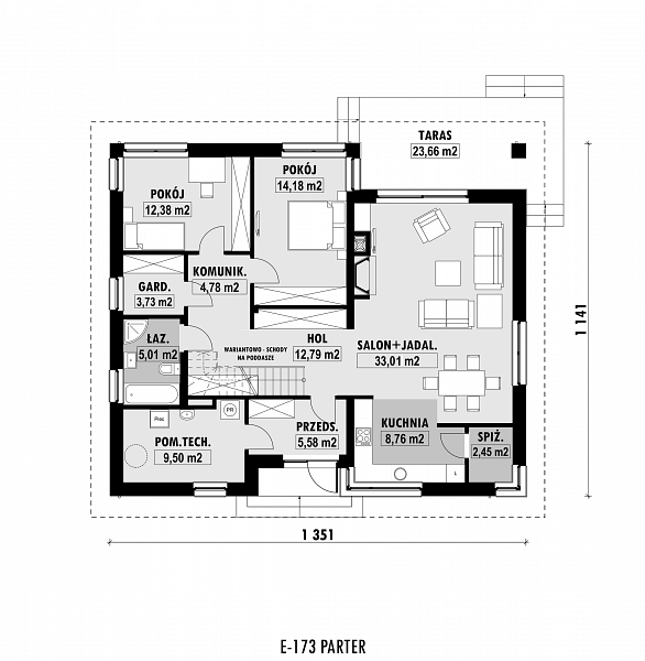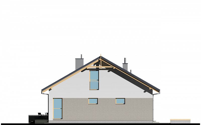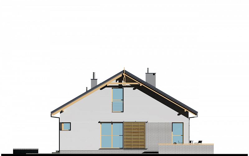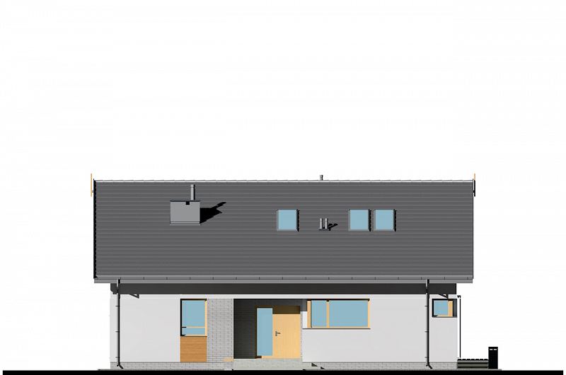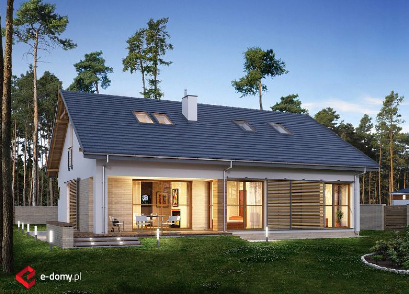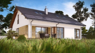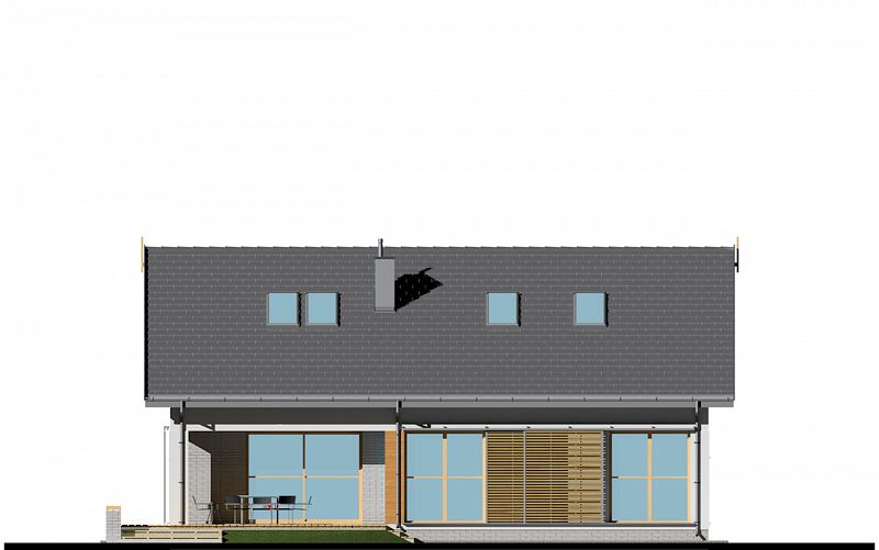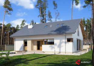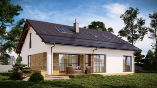 Projekt tradycyjnego domu z dachem dwuspadowym. W projekcie bardzo łatwo można zaadaptować poddasze. Prosta bryła, oparta na rzucie prostokąta. W części dziennej zaplanowano salon z jadalnią oraz półotwartą kuchnię ze spiżarnią, natomiast w części sypialnej dwa pokoje, WC oraz łazienkę z wanną i prysznicem. Dodatkowym atutem jest bardzo duże pomieszczenie techniczne.