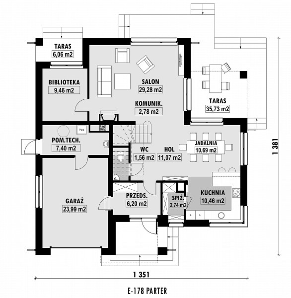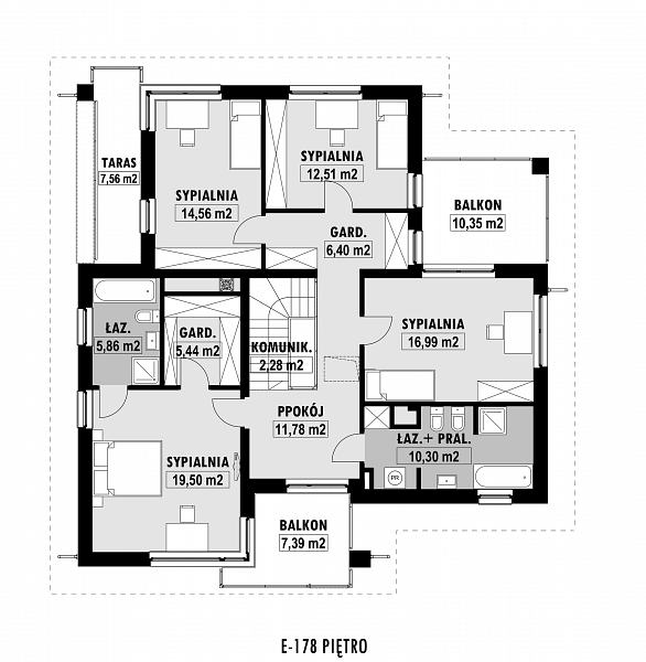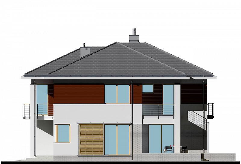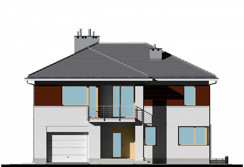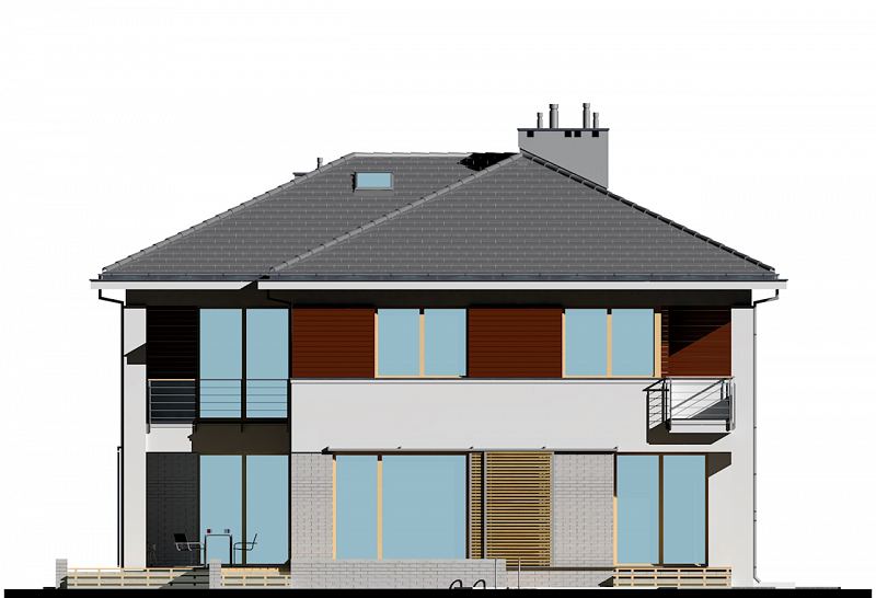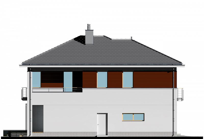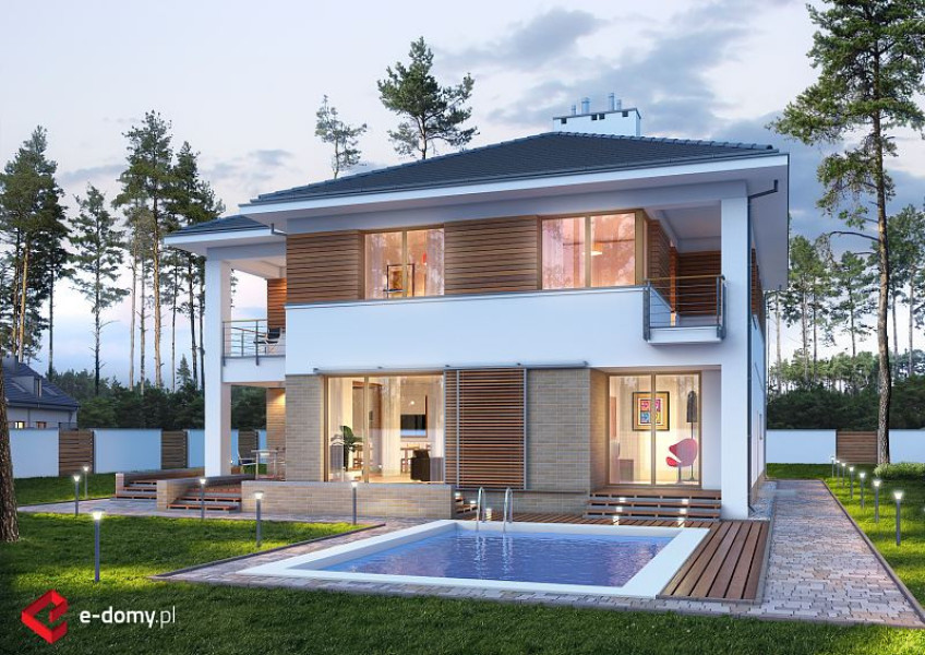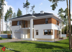 Mała rezydencja z jednostanowiskowym garażem. W części dziennej znajdują się: salon z aneksem bibliotecznym, zlokalizowanym od strony ogrodu oraz wydzielona kuchnia i jadalnia. Istnieje możliwość wyjścia na zadaszony taras, zarówno z salonu jak i z jadalni. Przy kuchni zlokalizowano dużą spiżarnię, a przy garażu pom. techniczne. W części sypialnej na piętrze zaplanowano 3 sypialnie, w tym jedną „rodziców” z łazienką i garderobą. Dodatkowo na piętrze znajduje się wspólna łazienka z wanną i prysznicem z wydzieloną przestrzenią na pralnię. Wszystkie sypialnie mają dostęp do tarasu lub balkonu.