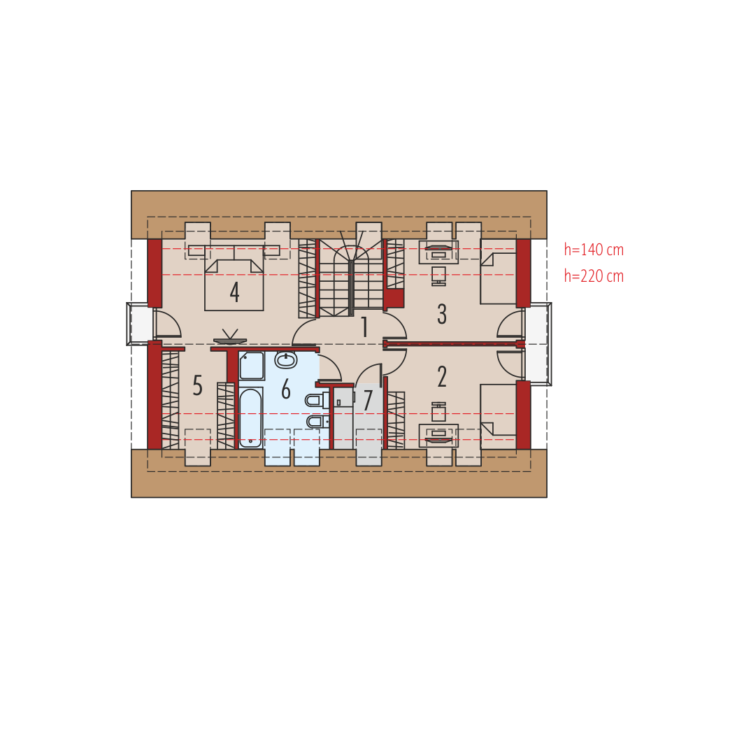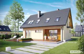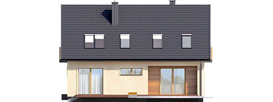 Charakterystyka: dom parterowy z poddaszem użytkowym, niepodpiwniczony Przeznaczenie: dom dla 3-4-osobowej rodziny Technologia i konstrukcja:Ściany zewnętrzne: murowane, dwuwarstwowe, pustaki ceramiczne 24 cm, ocieplenie 20 cmStrop: międzypiętrowy gęstożebrowy TerivaDach: konstrukcja drewniana, ocieplenie wełna mineralna 30 cm, dachówka ceramiczna firmy RöbenInne: schody wewnętrzne drewniane Rozwiązania instalacyjne:Ogrzewanie: kocioł gazowy kondensacyjny, rozprowadzenie ciepła: grzejnikiWentylacja: grawitacyjna Wykończenie:Elewacje: tynk cienkowarstwowy mineralny, np. w kolorze TO-PA001 z palety firmy Termo Organika, okładzina z płyty HPL z naturalną okleiną drewnianą firmy ProdemaStolarka: drewniana, PVC lub aluminiowaOtoczenie: system tarasowy ProDeck - deska kompozytowa Terra w kolorze wiśniOkna połaciowe: rozwiązania technologiczne i wyłaz dachowy firmy VELUX.Pobierz ekspercki poradnik VELUX i dowiedz się jak wybrać okna dachoweWersje w serii E11 - zapytaj o dostępność: - E11 ECONOMIC – wersja podstawowa - E11 II ECONOMIC – mniejsza powierzchnia użytkowa - E11 III ECONOMIC – dach z okapami, inne wykończenie elewacji - E11 ENERGO PLUS – instalacje energooszczędne: pompa ciepła, ogrzewanie podłogowe, wentylacja mechaniczna z rekuperacją i panele fotowoltaiczne - wszystkie wersje o takim samym układzie funkcji - odbicie lustrzane do każdej wersjiWszystkie wersje domów możliwe w dwóch standardach/wariantach instalacyjnych: - ENERGO: kocioł gazowy kondensacyjny, grzejniki, wentylacja grawitacyjna, OZE: kolektory słoneczne - ENERGO PLUS: pompa ciepła, ogrzewanie podłogowe, wentylacja mechaniczna, OZE: panele fotowoltaiczneIstnieją techniczne możliwości wykonania zmian: - podpiwniczenia budynku - wykonania budynku w technologii szkieletowej - dokonania zmian funkcjonalnych wg indywidualnych wymagańAtuty projektu okiem architekta: - Bardzo dobre parametry cieplne bryły - Wyraźny podział stref użytkowych - Salon z kominkiem i atrakcyjnym doświetleniem z trzech stron - Wygodna strefa nocna zaplanowana na poddaszu - Trzy sypialnie, każda z wyjściem na balkon - Główna sypialnia z przestronną garderobą - Praktyczne szafy wnękowe na parterze - Duże przeszklenia od strony ogrodu - Częściowo zacienione tarasy w podcieniu - Duże pomieszczenie kotłowni pozwala na zastosowanie dowolnego źródła ogrzewania