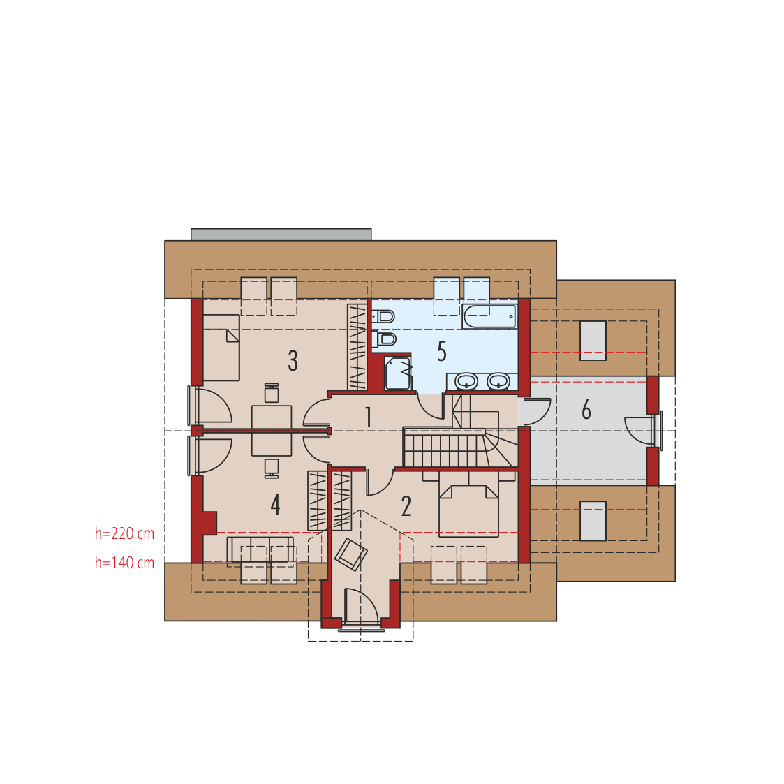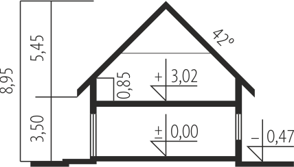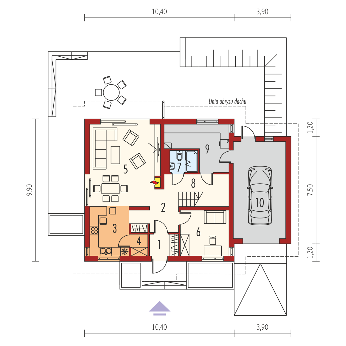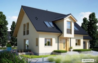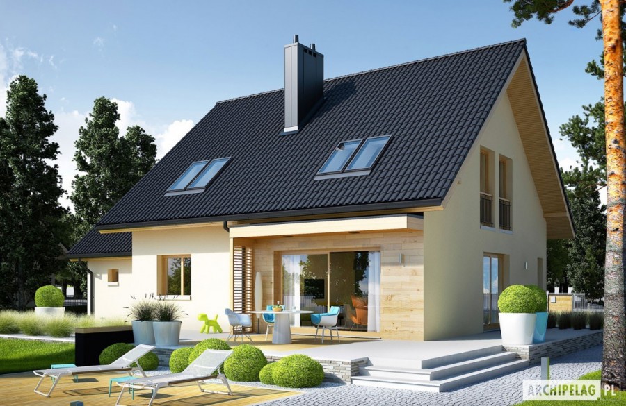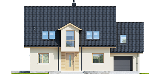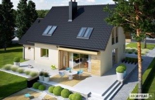 Charakterystyka: dom parterowy z poddaszem użytkowym, niepodpiwniczony, z garażem jednostanowiskowym Przeznaczenie: dom dla 3-5-osobowej rodziny Technologia i konstrukcja:Fundamenty: ławy, bloczki betonowe 24 cm, ocieplenie styropian 15 cm Ściany zewnętrzne: murowane, dwuwarstwowe, beton komórkowy firmy Solbet 24 cm, ocieplenie 20 cmŚciany wewnętrzne: murowane, bloczki betonu komórkowego firmy Solbet 24 cm i 12 cmStrop: międzypiętrowy gęstożebrowy Teriva Dach: konstrukcja drewniana, ocieplenie wełna mineralna 30 cm, dachówka cementowa IBF Inne: schody wewnętrzne drewniane Rozwiązania instalacyjne:Ogrzewanie: kocioł gazowy kondensacyjny, rozprowadzenie ciepła: grzejniki Wentylacja: grawitacyjna Wykończenie:Elewacje: tynk cienkowarstwowy mineralny w kolorze TO-PA003 z palety firmy Termo Organika, okładzina z płyty HPL z naturalną okleiną drewnianą firmy Prodema Stolarka: drewniana, PVC lub aluminiowa, drzwi wejściowe i brama garażowa firmy HörmannOkna połaciowe: rozwiązania technologiczne firmy FAKRO Otoczenie: system tarasowy ProDeck - deska kompozytowa Terra w kolorze orzechWersje - zapytaj o dostępność:- E5 ECONOMIC (wersja C) – bez garażu lub z garażem dwustanowiskowym- E5 ECONOMIC (wersja A) – taki sam układ funkcjonalny, inne wykończenie elewacji, z balkonem i płaskim przekryciem lukarny, różne wersje garaży- E5 ECONOMIC (wersja B) – taki sam układ funkcjonalny, inne wykończenie elewacji, z balkonem i płaskim przekryciem lukarny, dach bez okapów, różne wersje garaży- Odbicie lustrzane do każdej wersji Istnieje techniczna możliwość:- podpiwniczenia budynku- zbliźniaczenia lub wykonania domu dwulokalowego- wykonania budynku w technologii szkieletowej Atuty projektu okiem architekta: - Zwarta bryła budynku sprzyjająca energooszczędności - Doskonałe parametry cieplne- Funkcjonalne i ergonomiczne wnętrze z podziałem na strefę dzienną na parterze i nocną na poddaszu- Kuchnia z praktyczną spiżarnią- Gabinet zlokalizowany bezpośrednio przy strefie wejściowej - Wygodna strefa nocna zaplanowana na poddaszu- Strych oferujący wiele możliwości aranżacji- Duże przeszklenia od strony ogrodu oraz w jadalni - Przestronna strefa gospodarcza: duże pomieszczenie kotłowni