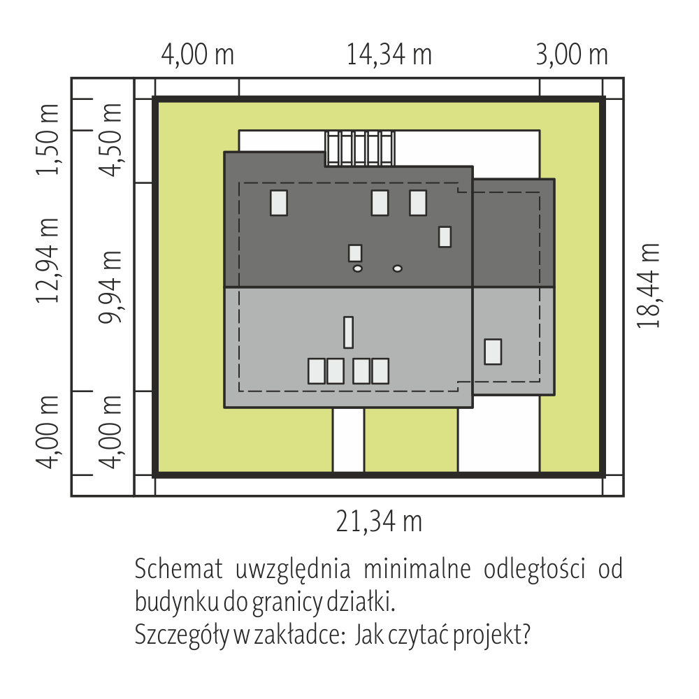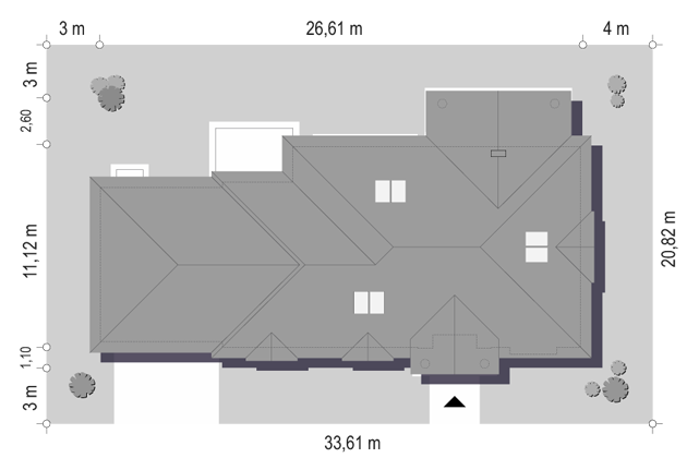 Niewielki dom piętrowy o nowoczesnej bryle dla 3-4 osobowej rodziny. Zastosowanie tradycyjnych technologii pozwala na budowę domu o niezwykłym wyglądzie. Stopniowanie wysokości co pół kondygnacji pozwala umieścić część gospodarczą w przyziemiu, a część dzienną lekko wynieść nad teren. Na parterze przewidziano salon z częścią jadalnianą, kuchnię, łazienkę i pokój dostępny z wiatrołapu. Część gospodarcza to garaż, pom. gospodarcze i pom. hobby. Na piętrze zorganizowano przestrzeń prywatną z sypialnią, pokojem dziecięcym, garderobą i łazienką. Schodami z piętra przechodzi się na taras na dachu.