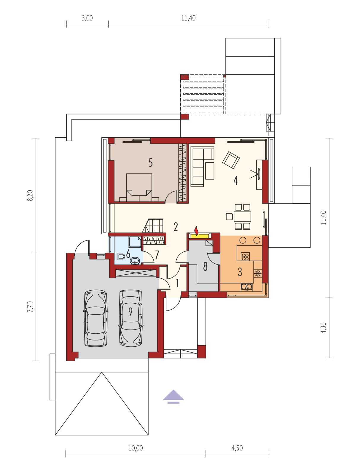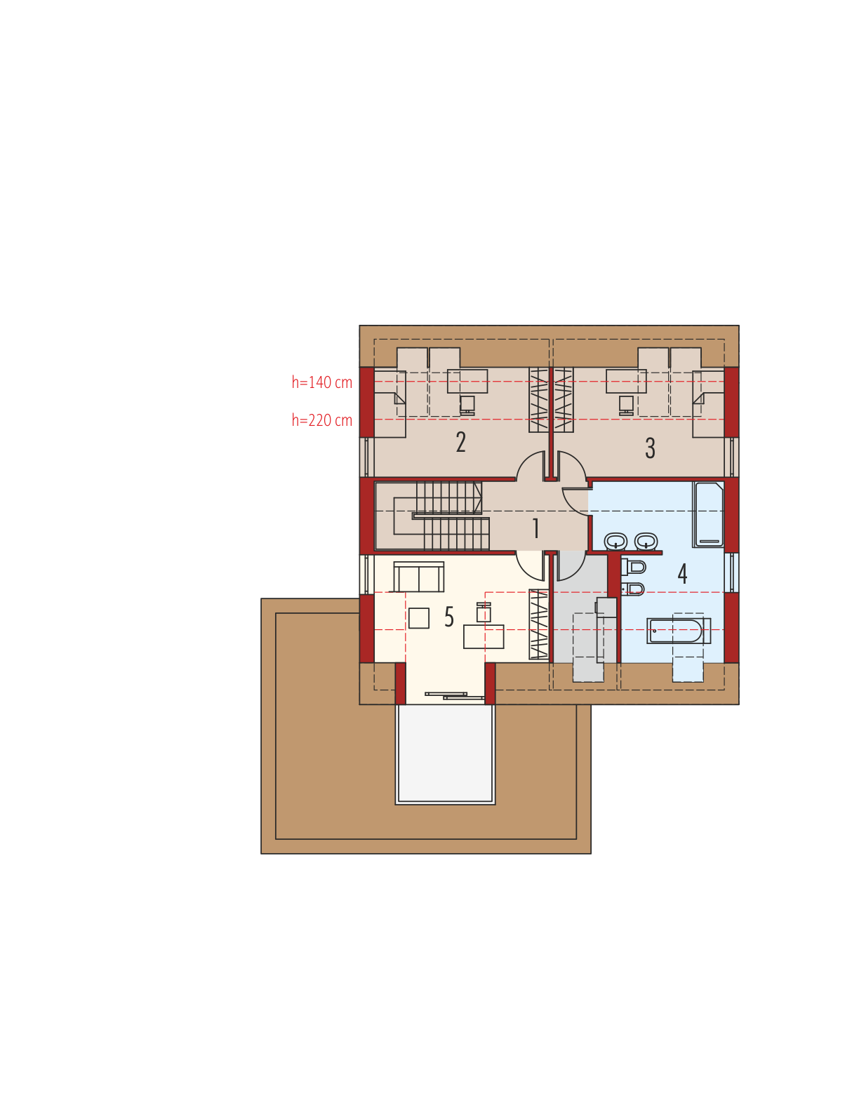 Charakterystyka: dom parterowy z poddaszem użytkowym, niepodpiwniczony, z garażem dwustanowiskowym Przeznaczenie: dom dla 4-5-osobowej rodzinyTechnologia i konstrukcja: Ściany zewnętrzne: murowane dwuwarstwowe, docieplenie wełna mineralna 20cm Strop: gęstożebrowy Dach: konstrukcja drewniana, ocieplenie wełna mineralna 30 cm, dachówka płaska lub inna o podobnych parametrach Inne: schody wewnętrzne drewnianeRozwiązania instalacyjne: Ogrzewanie: kocioł gazowy, rozprowadzenie ciepła: grzejniki Wentylacja: grawitacyjna Wykończenie: Elewacje: tynk cienkowarstwowy mineralny i okładzina drewniana Stolarka: drewniana, PCV lub aluminiowa W projekcie zastosowano rozwiązania technologiczne firmy VeluxOtoczenie: system tarasowy ProDeck - deska kompozytowa Terra w kolorze platyna.Wersje - zapytaj o dostępność:- Edgar II G1 – z garażem jednostanowiskowym- Edgar – inna aranżacja strefy wejściowej i tarasu ogrodowego, bez garażu oraz z garażem jedno i dwustnowiskowym- Odbicie lustrzane do każdej wersjiIstnieje techniczna możliwość:- podpiwniczenia budynku- zbliźniaczenia lub wykonania domu dwurodzinnegoAtuty projektu okiem architekta: - Bryła sprzyjająca energooszczędności, zminimalizowane ryzyko występowania mostków termicznych - Okna o niskim współczynniku przenikania ciepła - Funkcjonalne i ergonomiczne wnętrze - Praktyczna, duża kuchnia z dostępem do przestrzeni gospodarczej - Reprezentacyjny salon z kominkiem - Główna sypialnia na parterze - Dwie komfortowe sypialnie na poddaszu - Elegancka kompozycja elewacji - Zadaszona strefa wejściowa – ochrona przed deszczem i śniegiem - Oryginalny taras na poziomie poddasza, dostępny z gabinet- Piękny taras z dekoracyjną pergolą na poziomie parteru - Duże pomieszczenie kotłowni pozwala na zastosowanie dowolnego źródła ogrzewania
