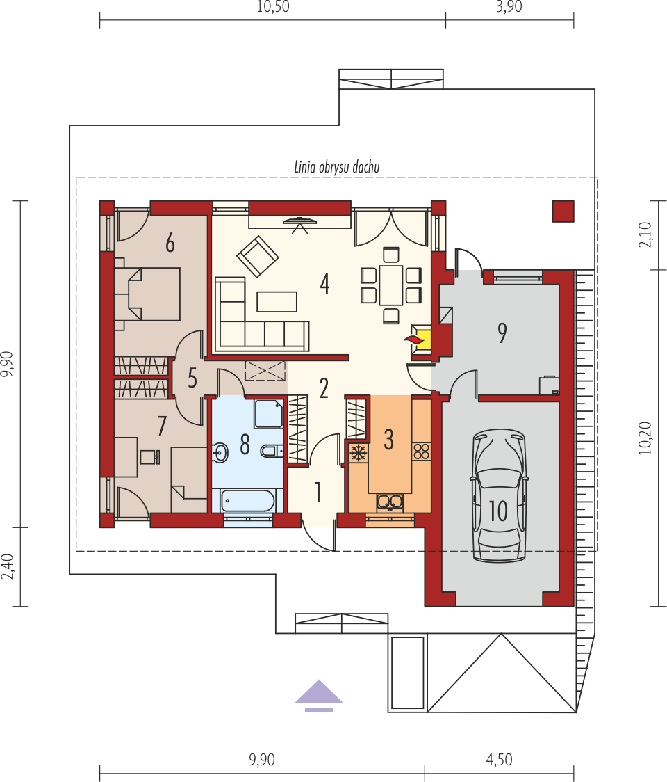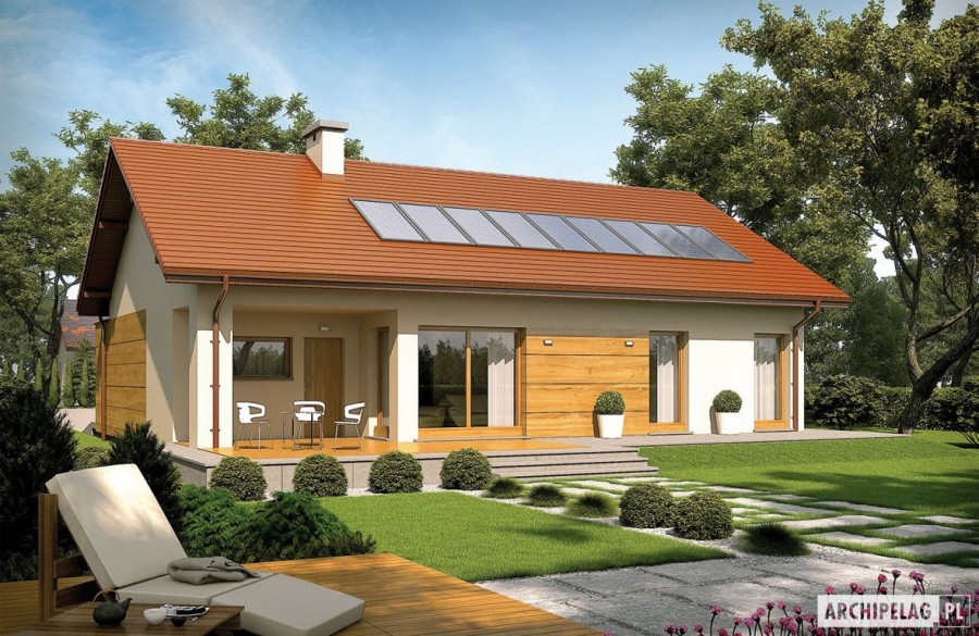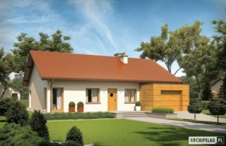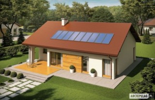 Charakterystyka: Dom parterowy, niepodpiwniczony, z garażem jednostanowiskowym.Przeznaczenie: Dom dla 2-3-osobowej rodzinyTechnologia i konstrukcja: Ściany zewnętrzne: murowane, dwuwarstwowe, beton komórkowy, ocieplenie styropian Termo Organika 20 cm Strop i stropodach nad garażem: międzypiętrowy, gęstożebrowy Teriva, ocieplenie wełna mineralna Isover 30 cm, stropodach, ocieplenie wełna mineralna Isover 24 cm Dach: konstrukcja drewniana, dachówka ceramiczna płaska firmy Röben. lub inna o podobnych parametrach. Więźba dachowa dostępna również w prefabrykacji drewnianej w systemie płytki kolczastej Mitek. Rozwiązania instalacyjne:Ogrzewanie: kocioł gazowy kondensacyjny firmy Viessmann, rozprowadzenie ciepła: grzejniki firmy Purmo Wentylacja: grawitacyjna OZE: kolektory słoneczne firmy Viessmann Dodatkowo: stacja uzdatniania wody firmy ViessmannWykończenie:Elewacje: tynk cienkowarstwowy mineralny i okładzina drewnianaStolarka okienna: drewniana, PCV lub aluminiowa. Rolety zewnętrzne w systemie CleverBox firmy BeCleverWersje - zapytaj o dostepność:- Edwin II G1 – inne wykończenie zewnętrzne oraz geometria dachu- Odbicia lustrzane do wszystkich wersji Istnieje techniczna możliwość:- zbliźniaczenia lub wykonania domu dwurodzinnego Atuty projektu okiem architekta - Optymalny współczynnik kształtu budynku A/V sprzyjający energooszczędności- Okna o niskim współczynniku przenikania ciepła- Zwarta bryła budynku sprzyja oszczędności energii niezbędnej do ogrzania domu i utrzymania w nim ciepła- Znakomite parametry cieplne- Funkcjonalne i ergonomiczne wnętrze- Salon z kominkiem oferujący wiele możliwości aranżacji- Zadaszony taras w podcieniu- Subtelna kompozycja elewacji- Garaż oddzielony termicznie od ogrzewanej części budynku- Duże pomieszczenie kotłowni pozwala na zastosowanie dowolnego źródła ogrzewania