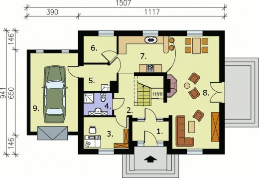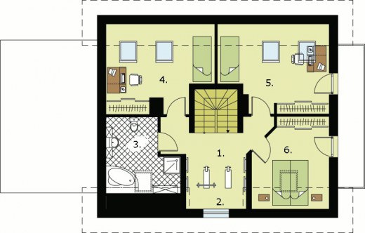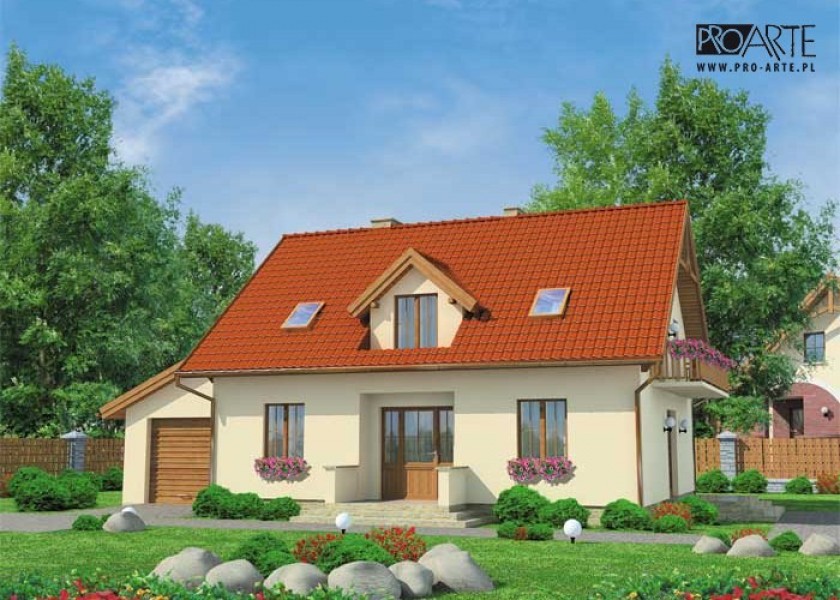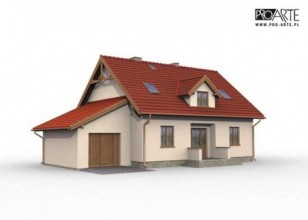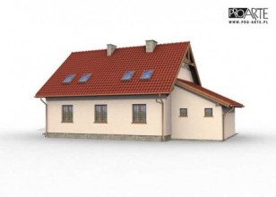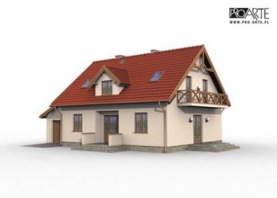 EL PASO- dom jednorodzinny z poddaszem użytkowym i garażem.Przyjazny, efektowny i wygodny. Taki właśnie jest El Paso. Szerokie, częściowo przeszklone wejście w płytkiej wnęce, ujęto po bokach w ramę dwóch niewielkich murków. W połączeniu ze schodkami i sporym podestem powstał w ten sposób przyjemny, otwarty ganeczek. Nad wejściem, z dwuspadowego dachu wyrasta urocza facjatka z dużym oknem, po jej bokach rozmieszczono symetrycznie dwa okna połaciowe. Do jednej z bocznych ścian przylega garaż, drugą zdobi kamienny tarasik, długi balkon (wspólny dla dwóch pokoi na poddaszu) oraz gustowny element dekoracyjny w szczycie dachu. We wnętrzu, na parterze dominuje duży pokój dzienny, w którym wydzielono też kącik jadalny pokój ten jest bowiem połączony z funkcjonalną kuchnią zaopatrzoną w spiżarkę. Na parterze jest jeszcze jeden pokój, który może pełnić funkcję gabinetu lub pokoju gościnnego w zależności od potrzeb. Poddasze zaprojektowano tak, by domownikom mieszkało się przyjemnie i wygodnie. Oprócz dwóch pokoi, sypialni i łazienki znalazło się tu miejsce na pomieszczenie rekreacyjne, idealne na urządzenie domowej siłowni. Projekt składa się z części architektonicznej, konstrukcyjnej, wewnętrznych instalacji sanitarnych i instalacji elektrycznej. W projekcie załączone są podstawowe zestawienie stali, drewna i stolarki okienno-drzwiowej. Do projektu dołączamy bezpłatną zgodę na wprowadzenie zmian, oświadczenie projektantów o wykonaniu projektu zgodnie z obowiązującymi normami i przepisami oraz kserokopie uprawnień projektantów wraz z aktualnym wpisem do izby. W przypadku zamówienia projektu w technologii lekkiej, drewnianej konstrukcji szkieletowej, powierzchnia użytkowa budynku jest o około 7% większa. Wysokość ściany kolankowej 1m