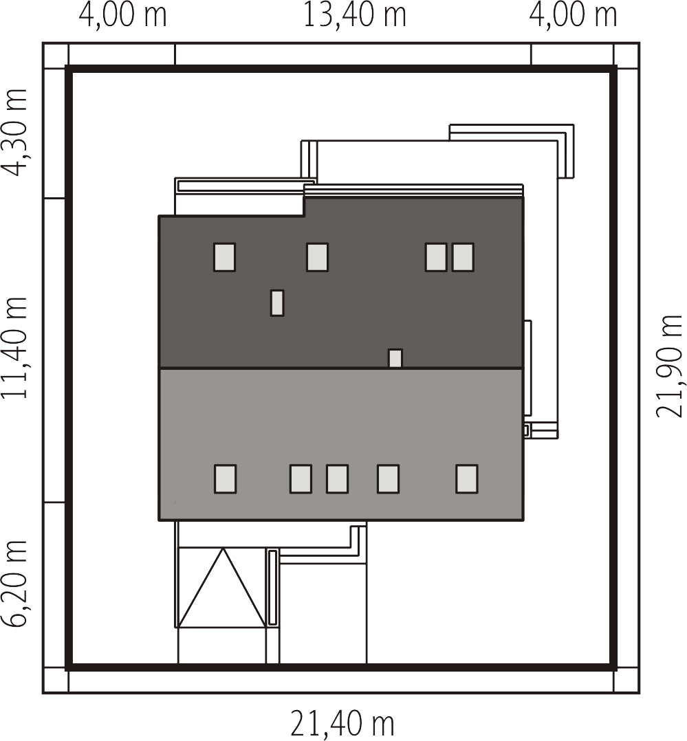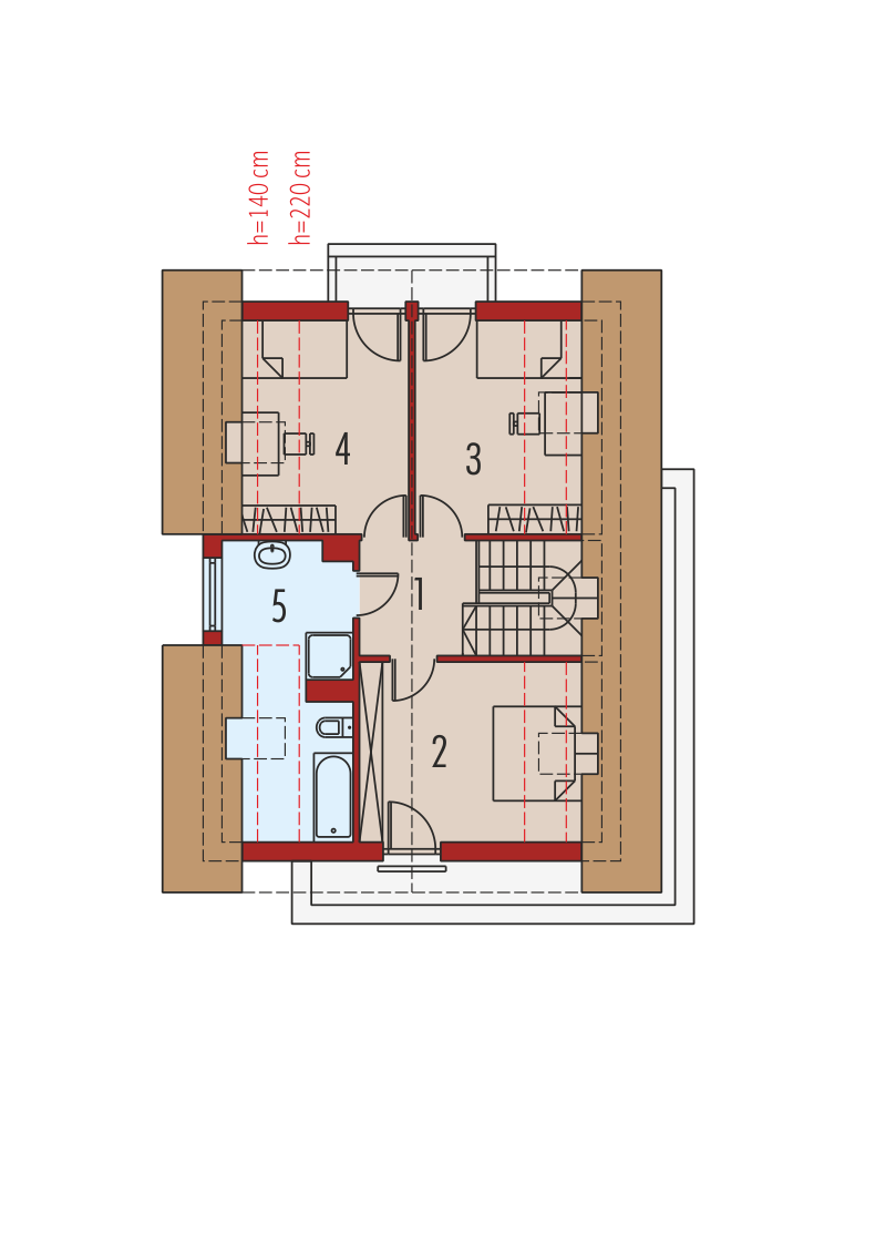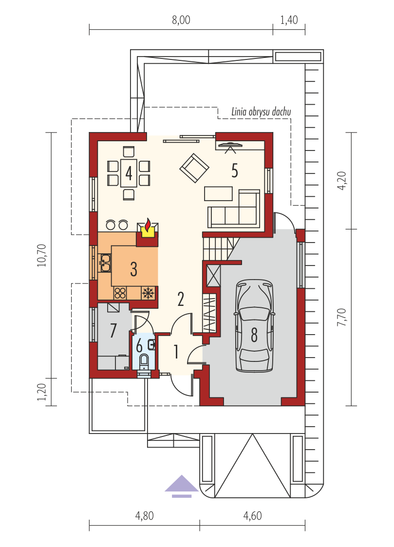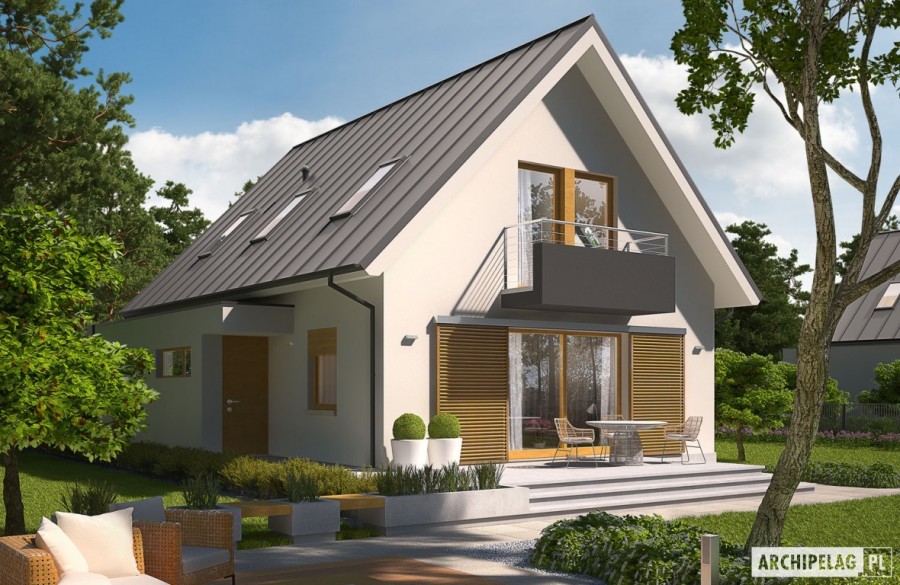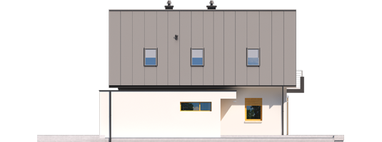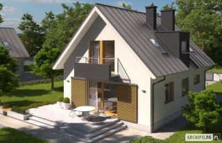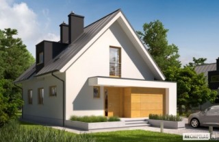 Charakterystyka: Dom parterowy z poddaszem użytkowym, niepodpiwniczony, z garażem jednostanowiskowym Przeznaczenie: Dom dla 3-4 osobowej rodzinyTechnologia i konstrukcja: Ściany zewnętrzne: murowane Strop: gęstożebrowy Dach: konstrukcja drewniana, blacha na rąbek stojący Classic firmy Ruukki. Inne: schody wewnętrzne żelbetoweRozwiązania instalacyjne: Ogrzewanie: kocioł gazowy, rozprowadzenie ciepła: grzejniki Wentylacja: grawitacyjna Wykończenie: Elewacje: tynk mineralny w kolorze TO-OR007 z palety firmy Termo Organika i okładzina drewniana, cokoły kamienne lub wykończone tynkiem. Stolarka: drewniana lub PCV. Rolety zewnętrzne w systemie CleverBox firmy BeClever.Dostępne wersje: - Odbicie lustrzane Istnieje możliwość: - podpiwniczenia budynku