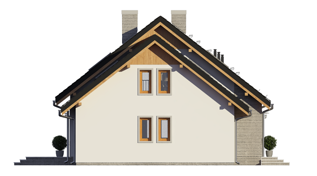 Z przodu wydaje się całkiem klasyczny... a potem niezłe zaskoczenie! Takiego tarasu na piętrze jeszcze nie widziałam w żadnym projekcie. Nie wiem, czy połączenie sypialni tarasem jest takie zupełnie okej, może wolalabym mieć balkon dla siebie, ale wygląda bardzo ciekawie z zewnątrz!