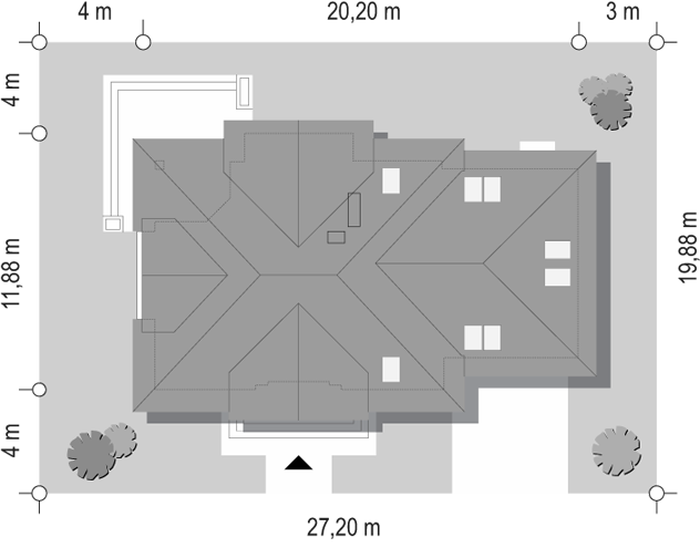 Niewielki, jednorodzinny dom parterowy, odpowiadający potrzebom 3 - 4-osobowej rodziny. Optymalny układ pomieszczeń został podzielony na dwie strefy: dzienną - kuchnia i salon z jadalnią oraz nocną: dwie sypialnie i łazienka.Ściany: 2-warstwowe - YTONG 36,5 cm + styropian Termo Organika, Stropy: System Stropowy TECHNOBETON, Dach: dachówka, kąt nachylenia 30°