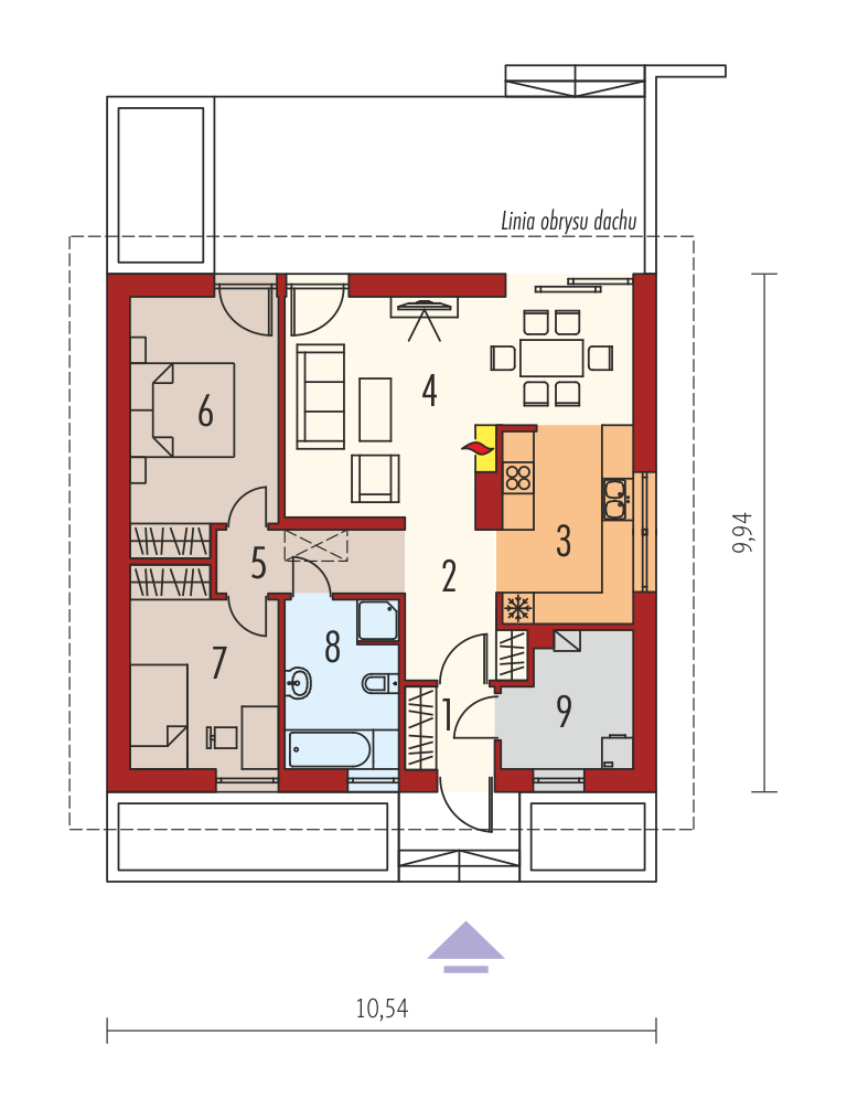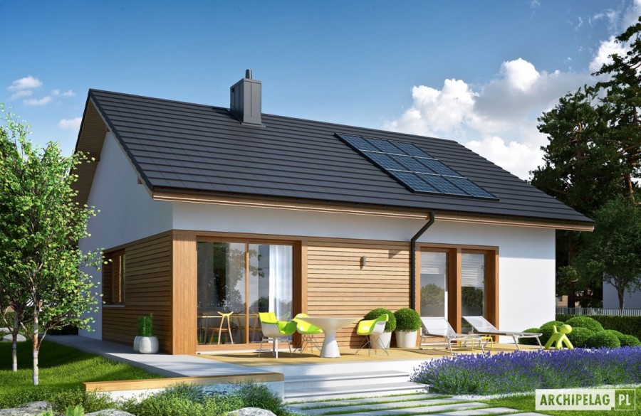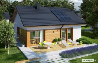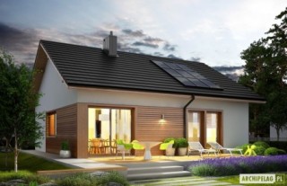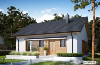 Charakterystyka: dom parterowy, niepodpiwniczonyPrzeznaczenie: dom dla 2-3-osobowej rodziny Technologia i konstrukcja:Fundamenty: ławy, bloczki betonowe 24 cm, ocieplenie styropian 15 cmŚciany zewnętrzne: murowane, dwuwarstwowe, bloki keramzytobetonowe 24 cm, ocieplenie 20 cmStrop: strop gęstożebrowy Teriva, ocieplenie wełna mineralna 30 cmDach: konstrukcja drewniana, ocieplenie wełna mineralna 30 cm, dachówka ceramiczna płaska Bergamo firmy Röben w kolorze antracytowym Rozwiązania instalacyjne:Ogrzewanie: kocioł gazowy kondensacyjny, rozprowadzenie ciepła: grzejnikiWentylacja: grawitacyjnaOZE: kolektory słoneczneWykończenie:Elewacje: tynk cienkowarstwowy mineralny w kolorze TO-PA003 z palety firmy Termo Organika, okładzina z płyty HPL z naturalną okleiną drewnianą firmy ProdemaStolarka: drewniana, PVC lub aluminiowa, rolety zewnętrzne w systemie CleverBox firmy BeClever Otoczenie: system tarasowy ProDeck - deska kompozytowa Terra w kolorze orzechWersje - zapytaj o dostępność:- Elmo Economic – z garażem jedno- lub dwustanowiskowym- Elmo II – IV Energo – podobny układ funkcjonalny, różne wersje garaży- Elmo V Energo - podobny układ funkcjonalny, system suchej zabudowy ścian działowych Rigips, prefabrykowana więźba dachowa, różne wersje garaży- każda wersja z inną propozycją wykończenia elewacji- Odbicie lustrzane do każdej wersji Istnieje techniczna możliwość:- podpiwniczenia budynku- zbliźniaczenia lub wykonania domu dwulokalowego- wykonania budynku w technologii szkieletowej Atuty projektu okiem architekta:- Zwarta bryła budynku z dachem dwuspadowym sprzyjająca energooszczędności- Funkcjonalne i ergonomiczne wnętrze z podziałem na strefę dzienną i nocną- Salon z kominkiem oraz dużymi przeszkleniami od strony ogrodu- Dwie sypialnie w tym główna z wyjściem na taras- Możliwość wykorzystania strychu dostępnego poprzez składane schody- Funkcjonalne szafy wnękowe